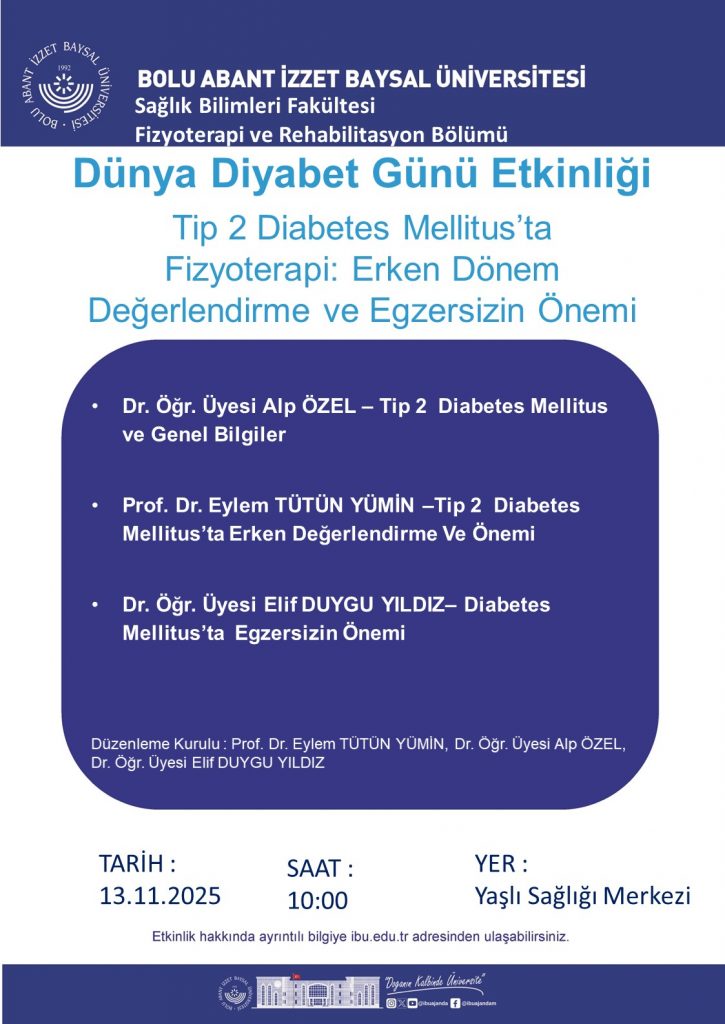 Fizyoterapi ve Rehabilitasyon Bölümü, Dünya Diyabet Günü kapsamında düzenlenecek etkinliğimize tüm öğrencilerimiz ve personelimiz davetlidir.