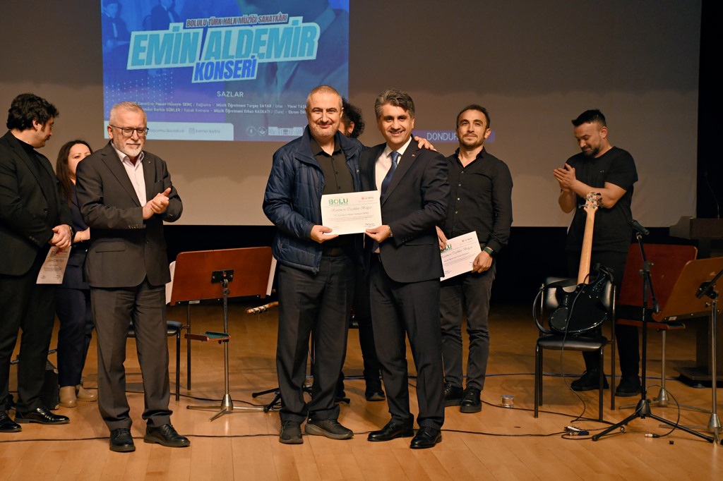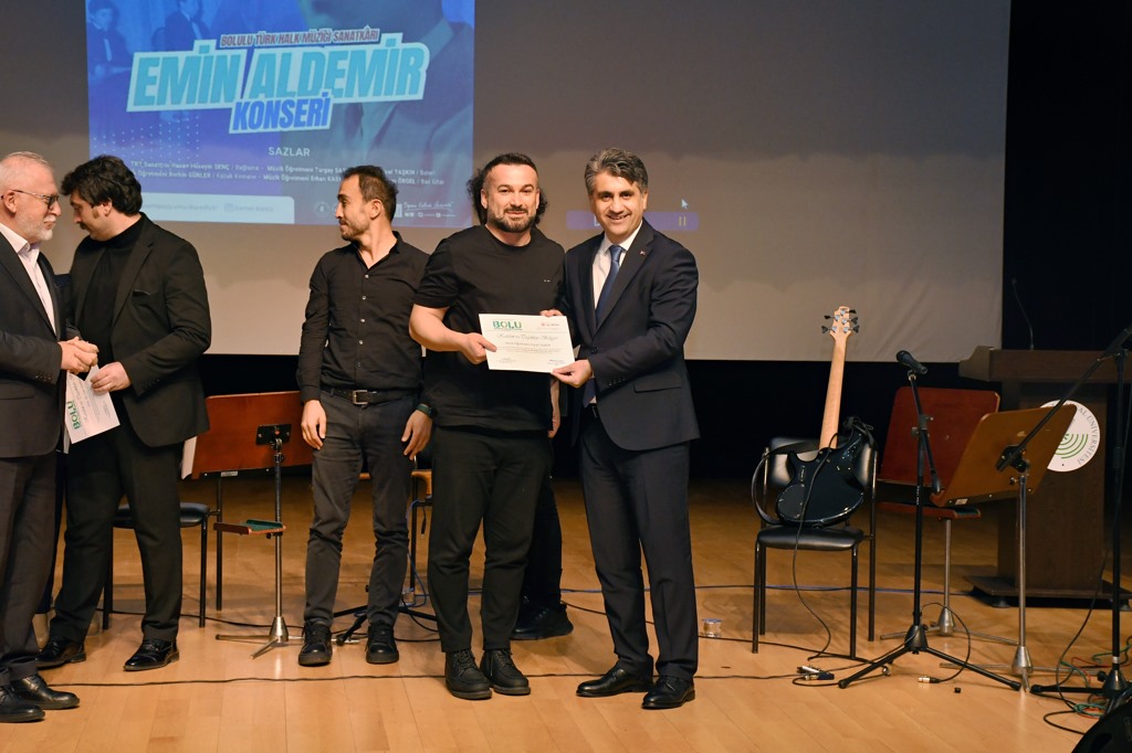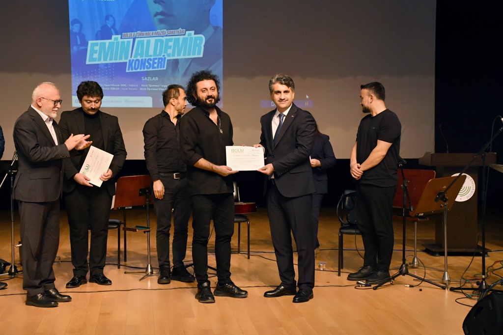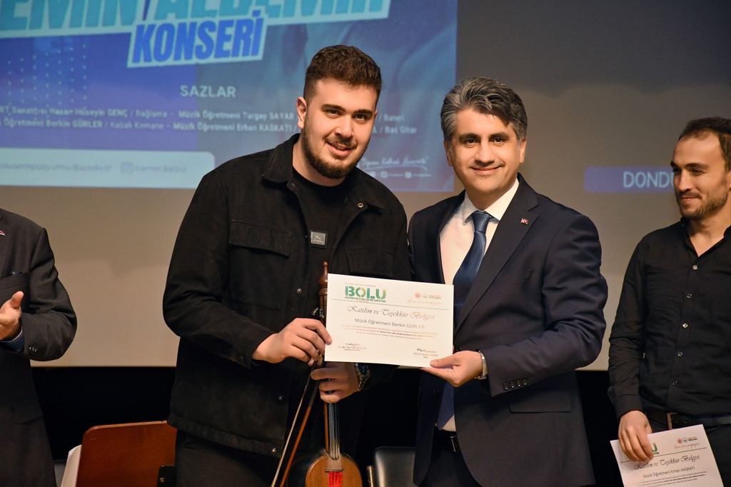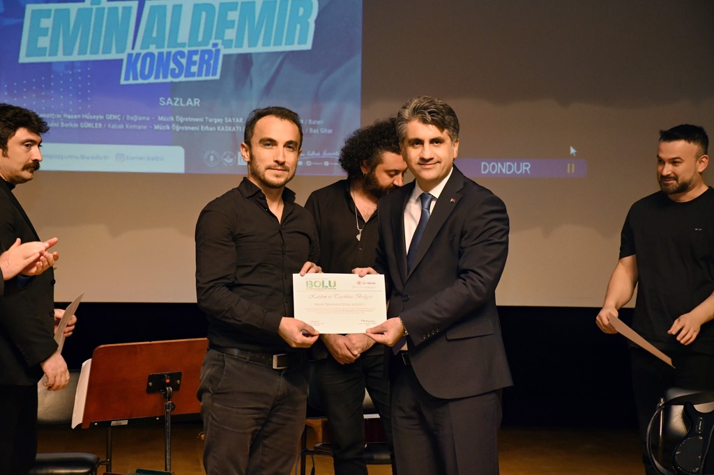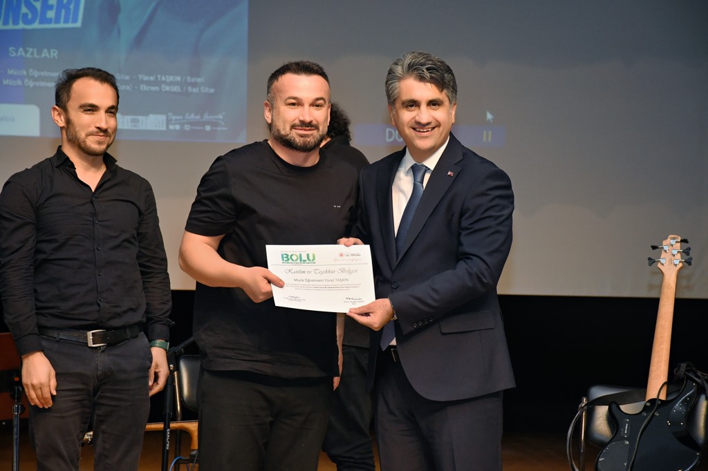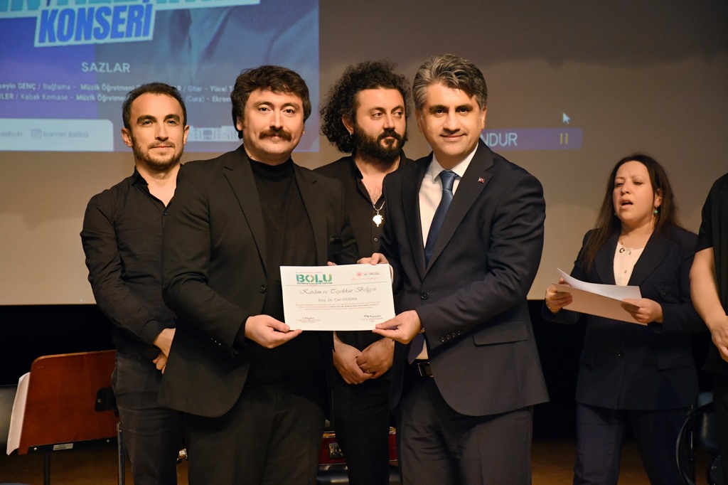 Konserin ardından Bolu Valisi Abdulaziz Aydın ve Üniversitemiz Rektörü Prof. Dr. Mustafa Alişarlı, Doç. Dr. Can Doğan ve saz ekibine teşekkür belgesi verdiler.