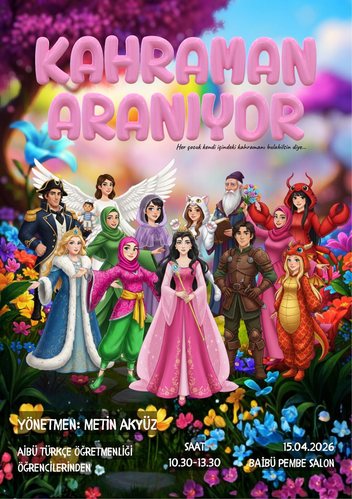 Üniversitemiz Türk Dili ve Edebiyatı Bölümü Öğretim Üyesi Doç. Dr. Metin AKYÜZ’ün, Eğitim Fakültesi Türkçe Öğretmenliği Bölümünde yürüttüğü “Tiyatro ve Drama Uygulamaları” dersi kapsamında, öğrencileriyle birlikte hazırladığı, her çocuğun kendi içindeki kahramanı buldurmayı amaçlayan “Kahraman Aranıyor” adlı çocuk oyunu sahnelenecektir.