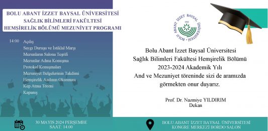 Bolu Abant İzzet Baysal Üniversitesi Sağlık Bilimleri Fakültesi Fizyoterapi ve Rehabilitasyon Bölümü 2023-2024 Akademik Yılı Mezuniyet ve And Töreni'mizi onurlandırmanızı dileriz.