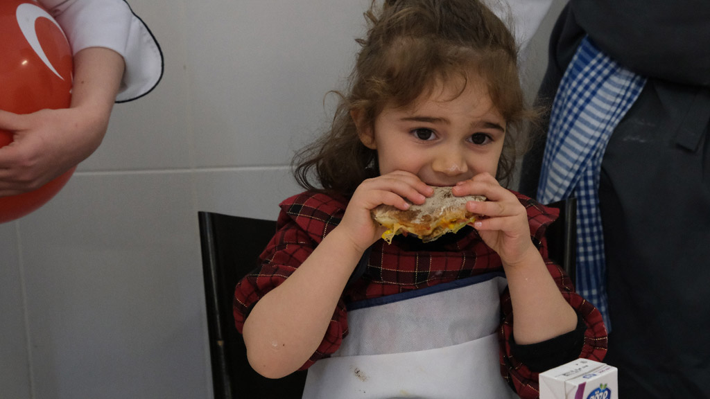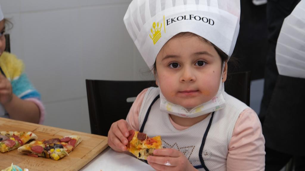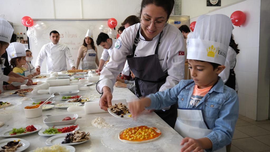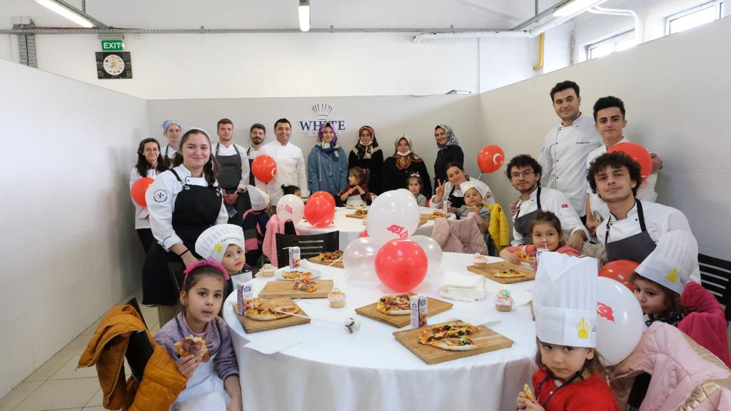 Üniversitemizin uygulama mutfağında üniversiteli ağabey ve ablalarıyla pizza ve kek yapan 23 Nisan çocukları, hamur açıp pizza malzemelerini hamurun üstüne yerleştirdiler. Renkli krema ve pasta malzemeleri ile hazırladıkları kekleri süslediler. Etkinliğin sonunda minikler, hazırladıkları kek ve pizzaları afiyetle yediler.