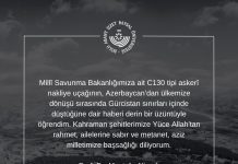 Millî Savunma Bakanlığımıza ait C130 tipi askerî nakliye uçağının, Azerbaycan’dan ülkemize dönüşü sırasında Gürcistan sınırları içinde düştüğüne dair haberi derin bir üzüntüyle öğrendim. Kahraman...