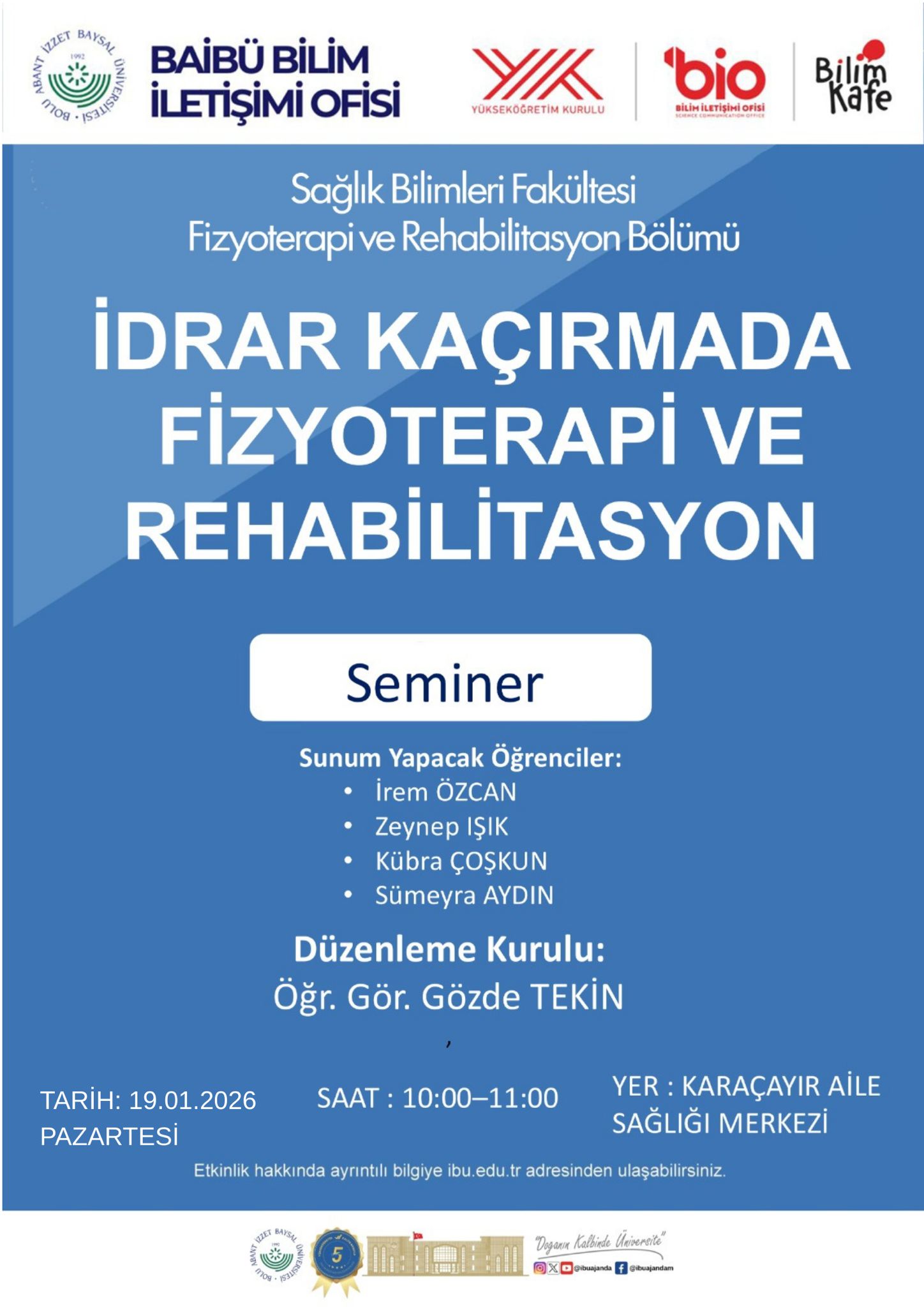 Üniversitemiz Sağlık Bilimleri Fakültesi Fizyoterapi ve Rehabilitasyon Bölümü tarafından, İdrar Kaçırmada Fizyoterapi ve Rehabilitasyon konulu seminer düzenlenecektir.