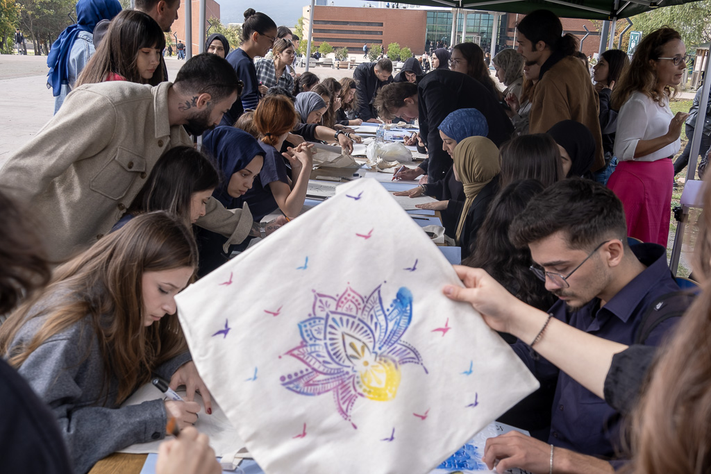 Üniversitemiz Güzel Sanatla Fakültesi Sanat Topluluğu tarafından Kampüs Karşılama Festivali kapsamında düzenlenen T-shirt ve Bez Çanta Boyama Atölyesi etkinliği Güzel Sanatlar Fakültesinin önünde açılan stantta gerçekleştirildi. Etkinlik yoğun ilgi görürken etkinliğe Üniversitemiz Rektör Yardımcısı Prof. Dr. Coşkun Karaca ve akademik ve idari personel ile öğrenciler katılırken etkinlikte keyifli ve renkli anlar yaşandı.