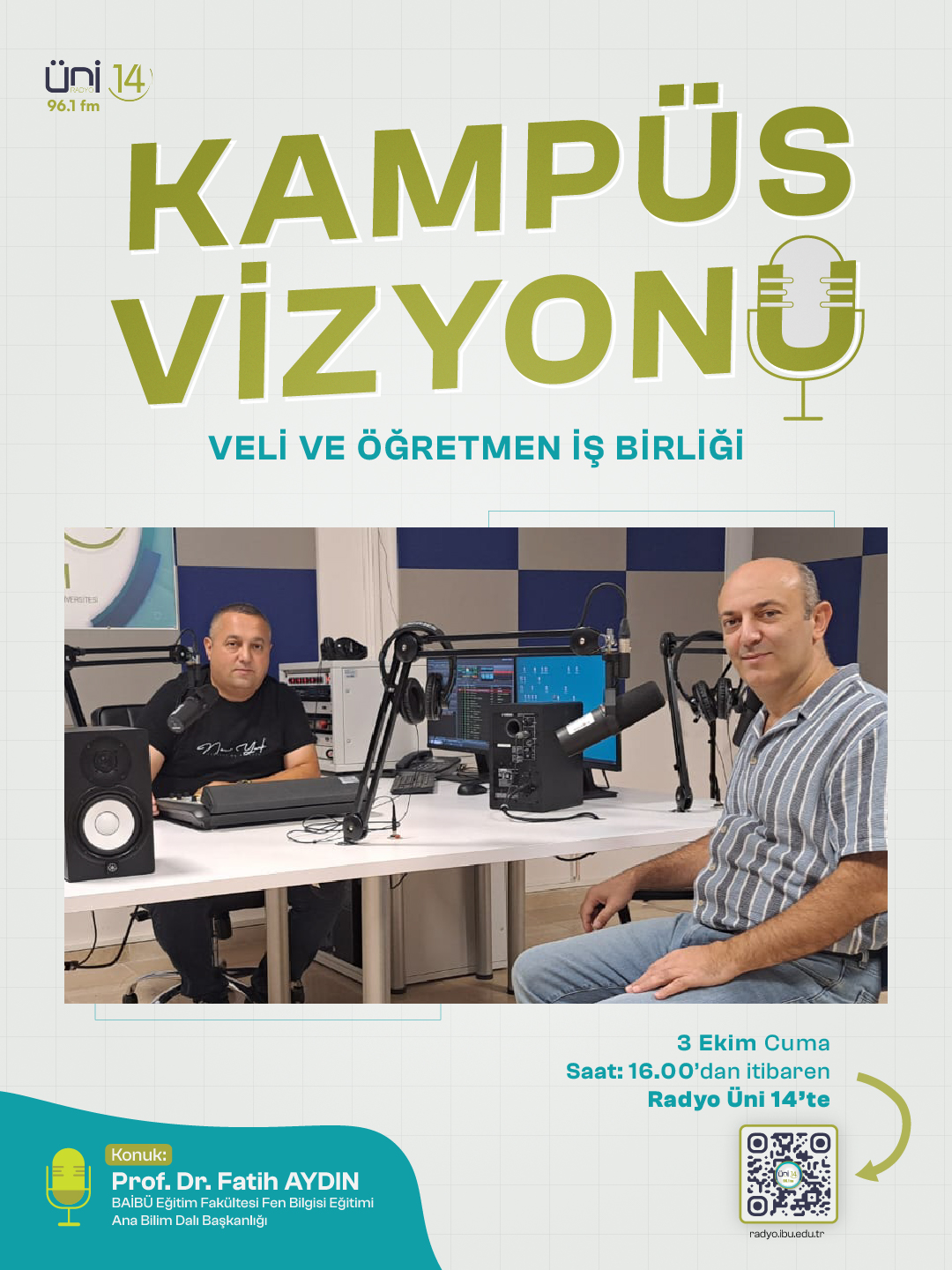 Radyo Üni 14 stüdyolarında “Kampüs Vizyonu” programında BAİBÜ Eğitim Fakültesi Fen Bilgisi Eğitimi Ana Bilim Dalı öğretim üyesi Prof. Dr. Fatih Aydın, “Veli ve Öğretmen İşbirliğinin Önemi” başlığıyla dinleyicilerle buluşuyor.