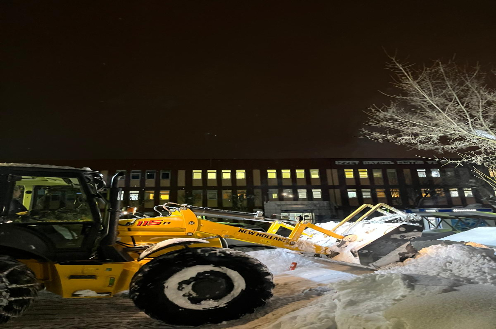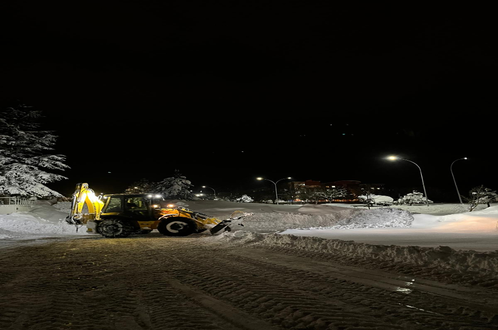 26 Aralık 2025 Cuma gününden bu yana devam eden olumsuz hava koşullarına karşı teyakkuzda olan ekiplerimiz, üniversite yerleşkesi içindeki ana ve ara yolları, yaya yollarını, bina giriş-çıkışlarını, otoparkları ve otobüs duraklarını açık tutmak için nöbetleşe şekilde gece gündüz görev başında bulunuyor.