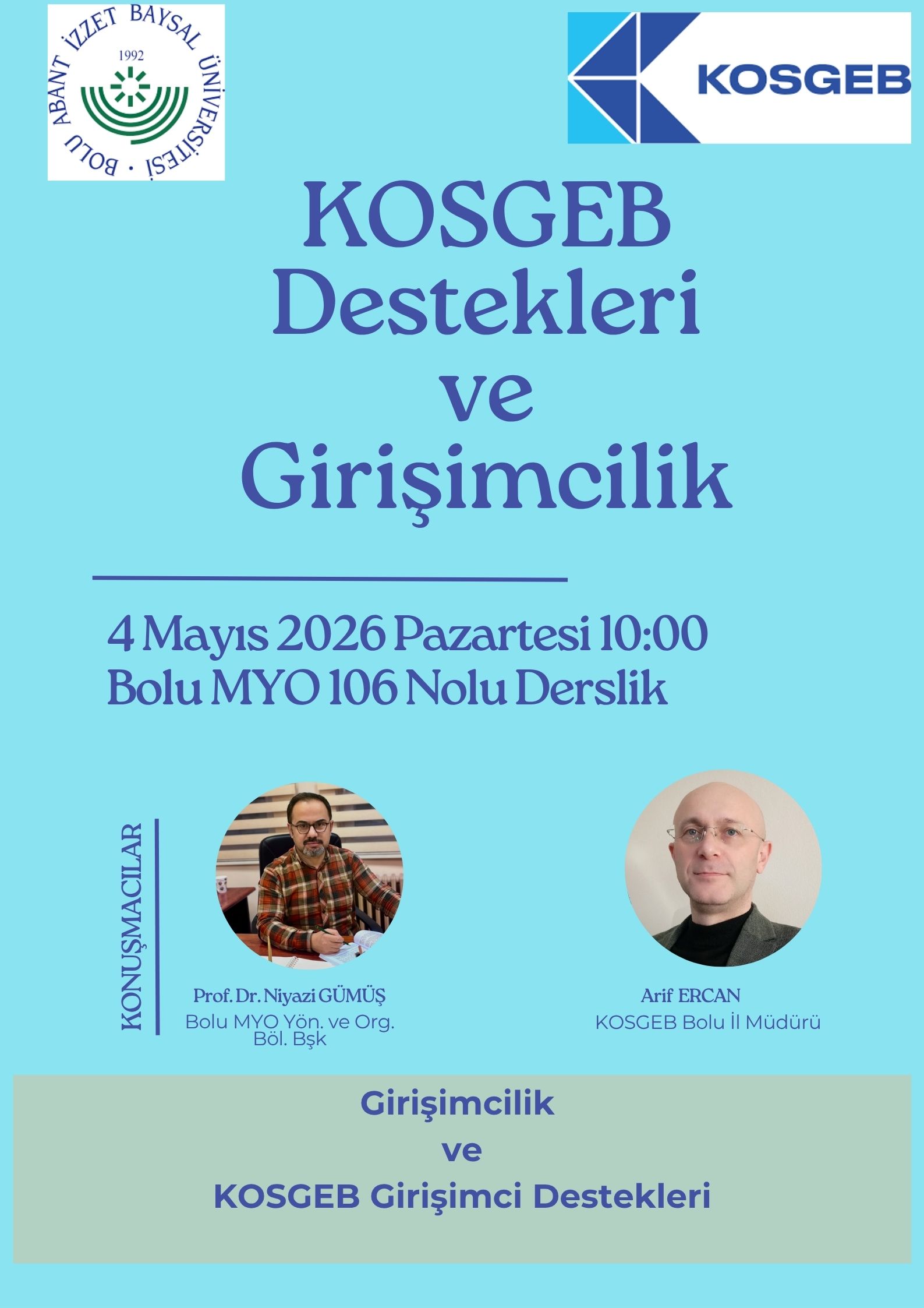 KOSGEB Bolu İl Müdürlüğü ve Üniversitemiz iş birliğiyle gerçekleştirilecek olan seminerde, girişimcilik süreçleri ve güncel KOSGEB destekleri ele alınacaktır.