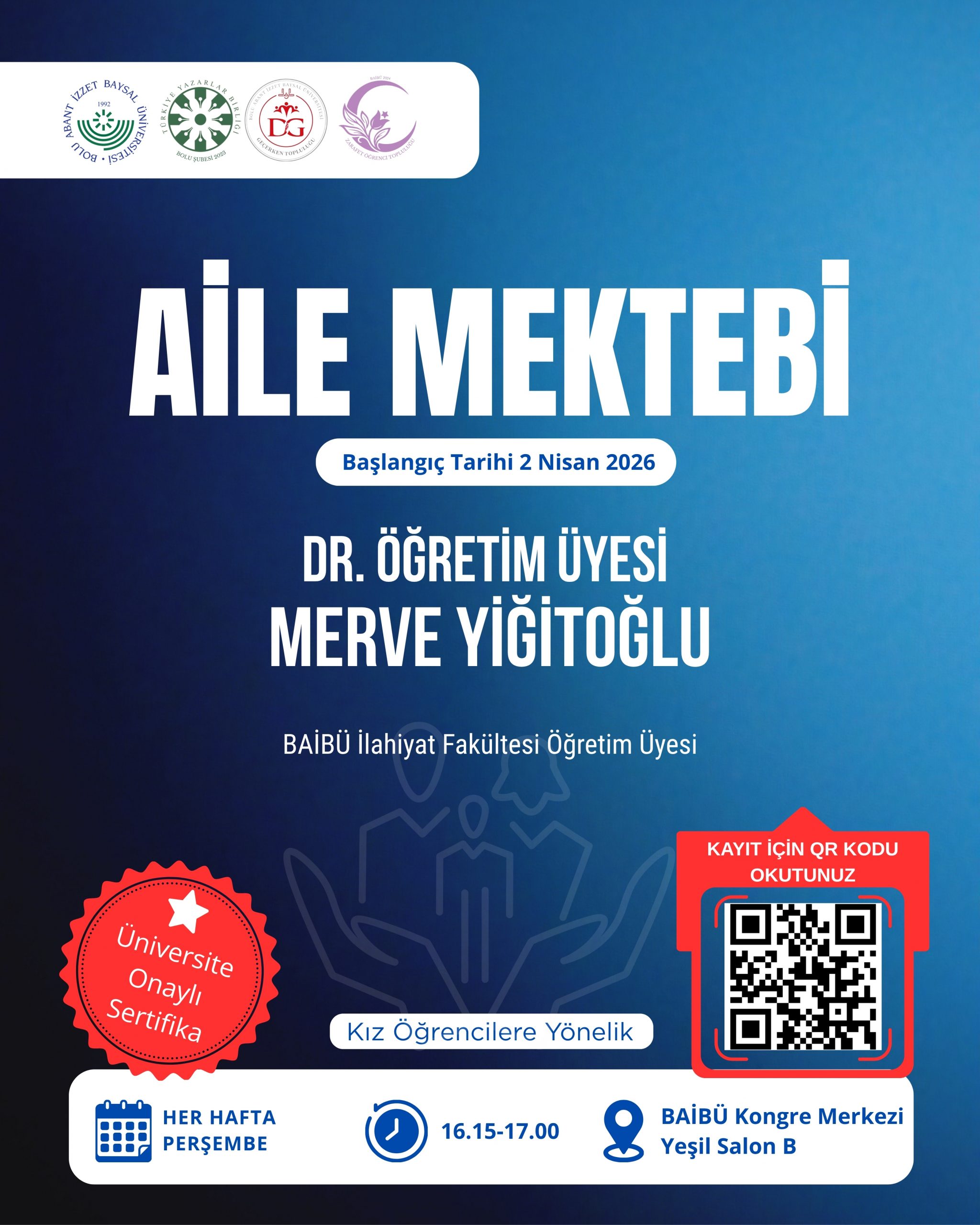 Türkiye Yazarlar Birliği Bolu Şubesi öncülüğünde, Bolu Abant İzzet Baysal Üniversitesi, Geçerken Öğrenci Topluluğu ve Zarafet Akademi Öğrenci Topluluğu iş birliğiyle gerçekleştirilecek olan bu anlamlı programda, İlahiyat Fakültesi Öğretim Üyesi Dr. Merve Yiğitoğlu kıymetli bilgi ve tecrübelerini kız öğrencilerle paylaşacak.