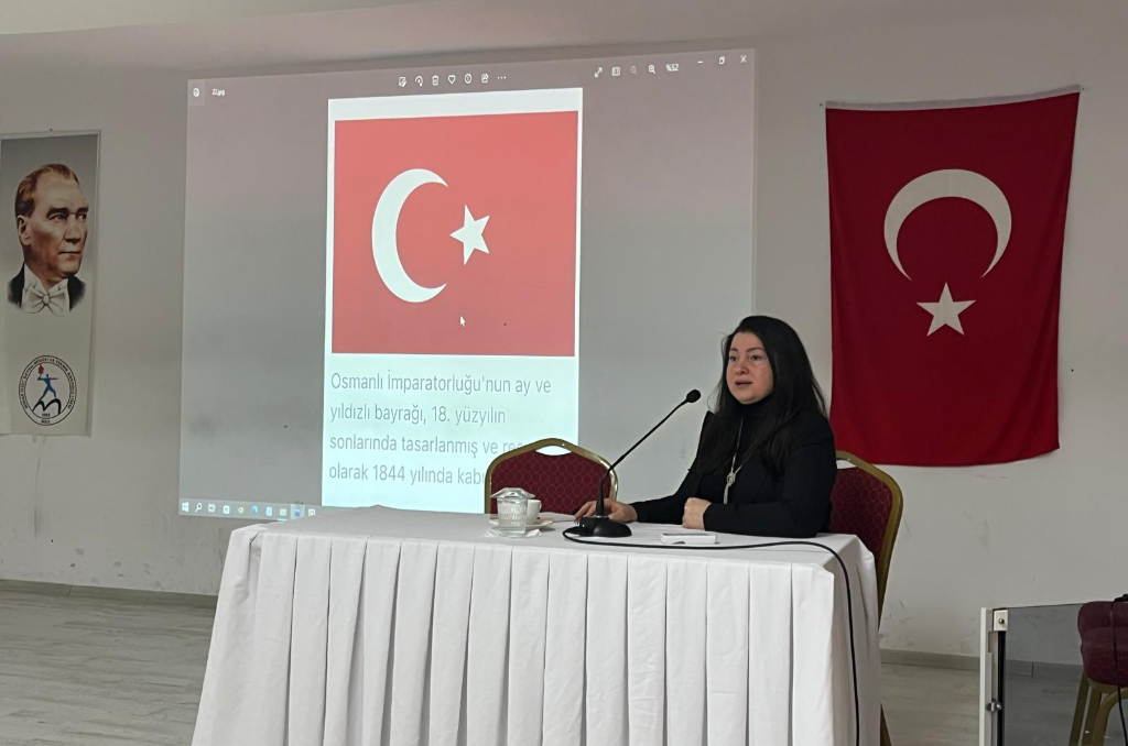 Sosyal sorumluluk çalışmaları kapsamında düzenlenen konferansta Dr. Aşçı, bayrağımızın tarihi ve anlamı ile egemenliğin ve özgürlüğün sembolü olan bayrağın bağımsızlıkla ilişkisini tarihi ve sosyolojik bilgiler ışığında anlattı.