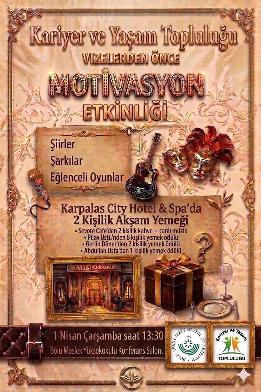 Kariyer ve Yaşam Topluluğu tarafından düzenlenen Motivasyon Etkinliği, 1 Nisan Çarşamba günü saat 13:30’da Bolu Meslek Yüksekokulu Konferans Salonu’nda gerçekleştirilecektir. Vizeler öncesinde öğrencilerin motivasyonunu artırmayı amaçlayan etkinlikte şiirler, şarkılar ve eğlenceli oyunlar yer alacak olup katılımcılar için çeşitli sürpriz ödüller de sunulacaktır.