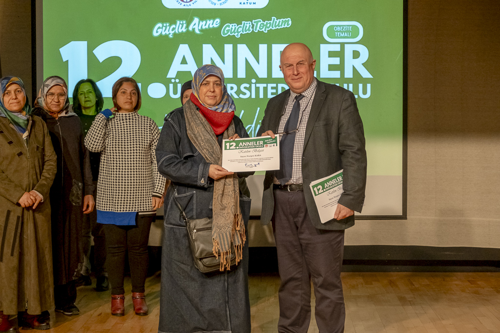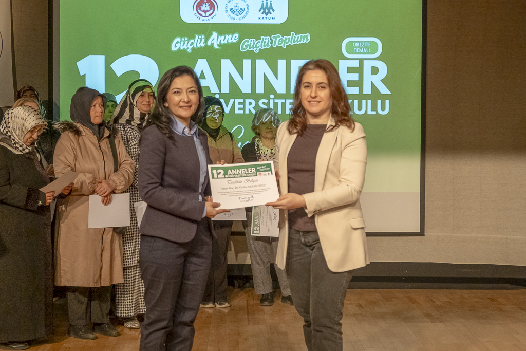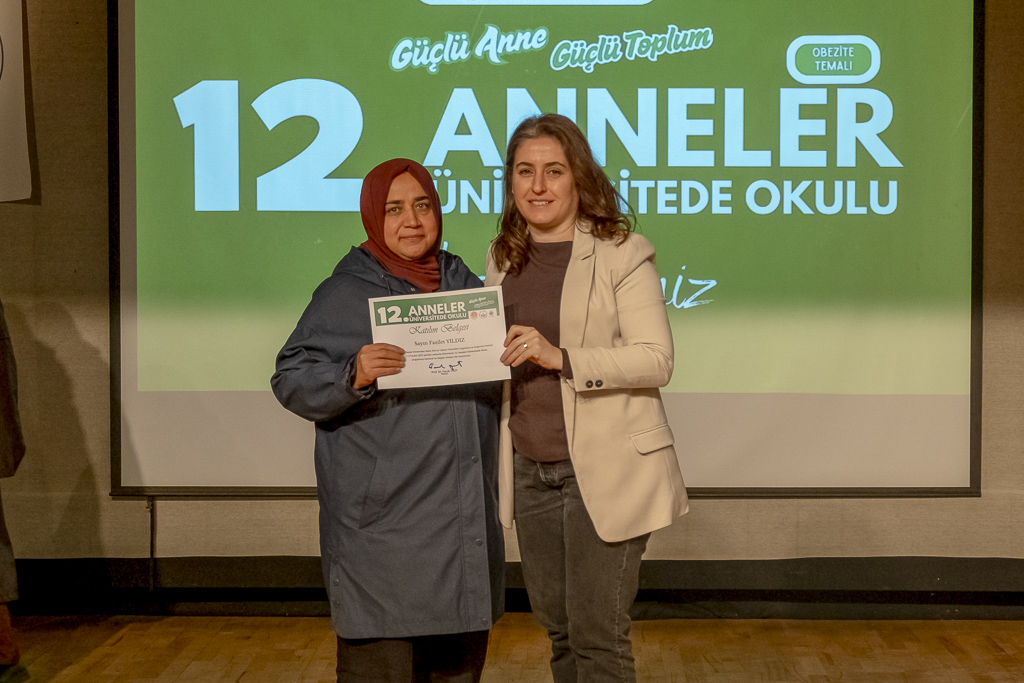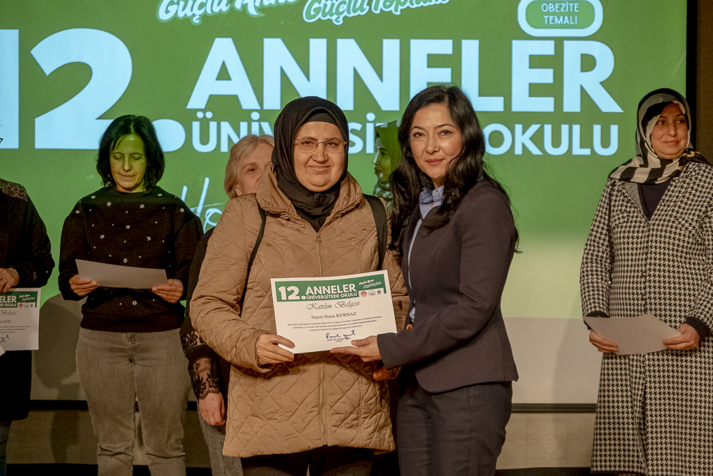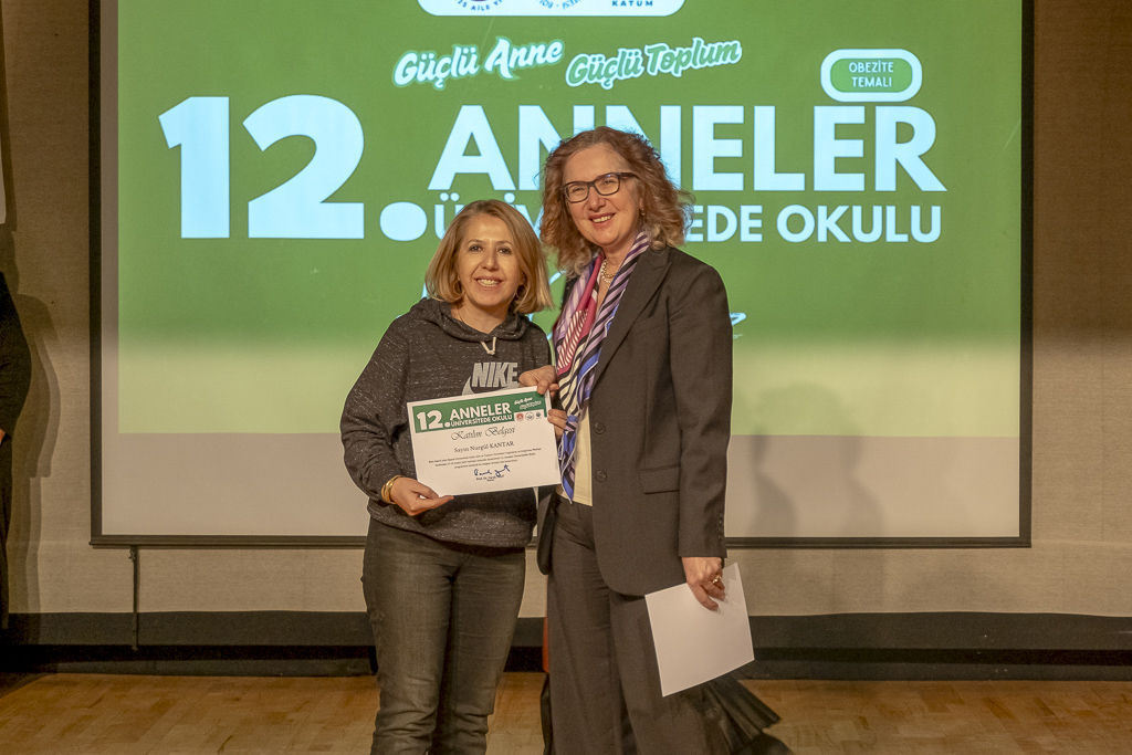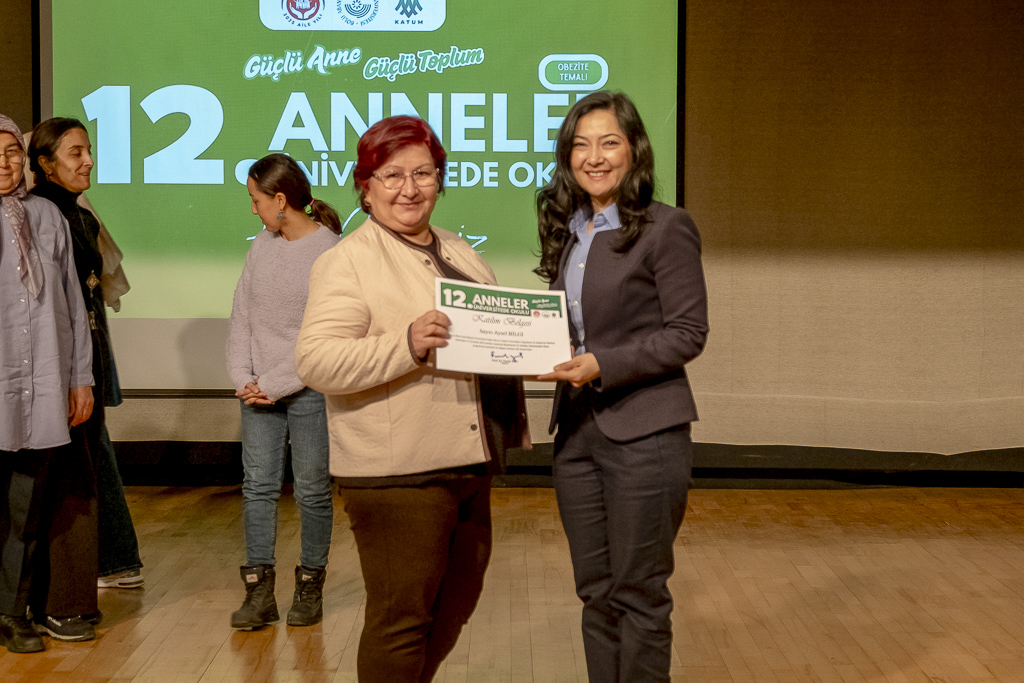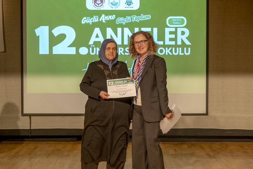 12.Anneler Üniversitede Okulu üçüncü gün etkinliklerinin sonunda sertifika töreni düzenlendi. Programın hazırlanmasında ve yürütülmesinde emeği geçen akademisyenlere teşekkür belgeleri, KATUM Müdürü Doç. Dr. Özden Gezer Oğuz tarafından takdim edildi. Annelere sertifikaları akademisyenler tarafından verildi. Obezite konusunda zengin akademik içeriğiyle annelerin bilgilendirildiği program, toplu fotoğraf çekiminin ardından sona erdi.