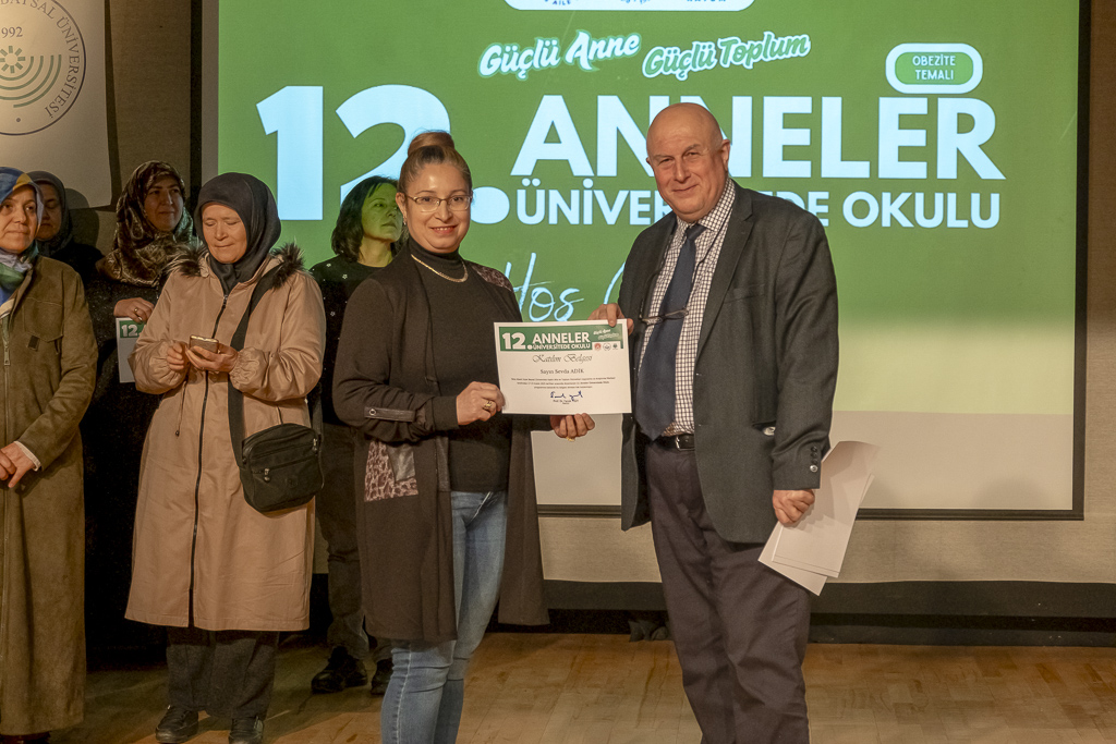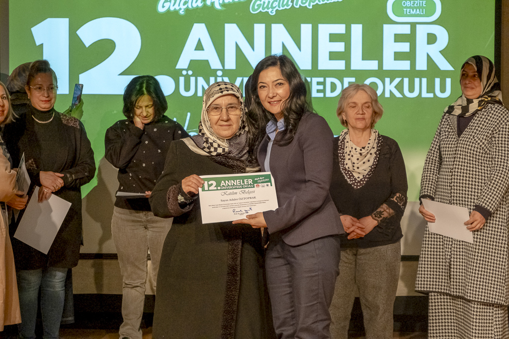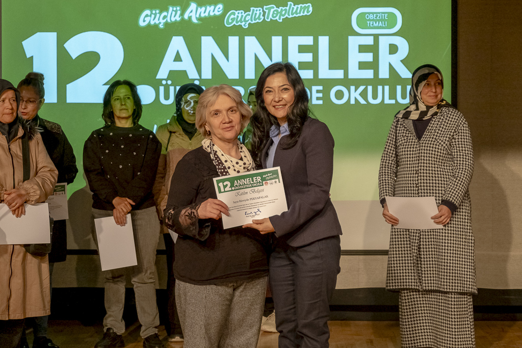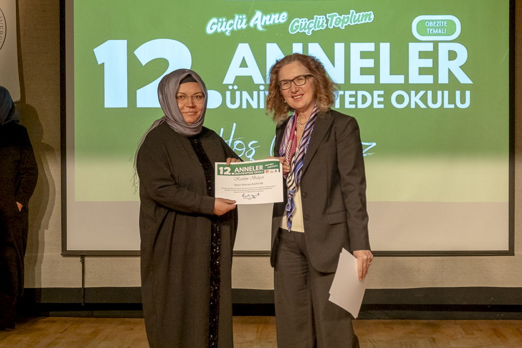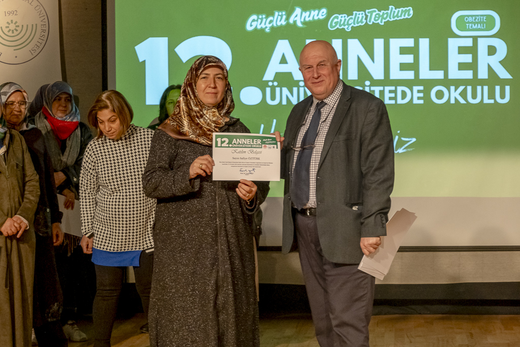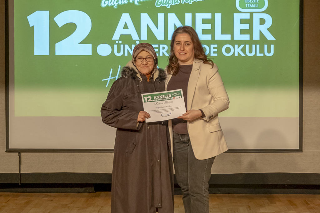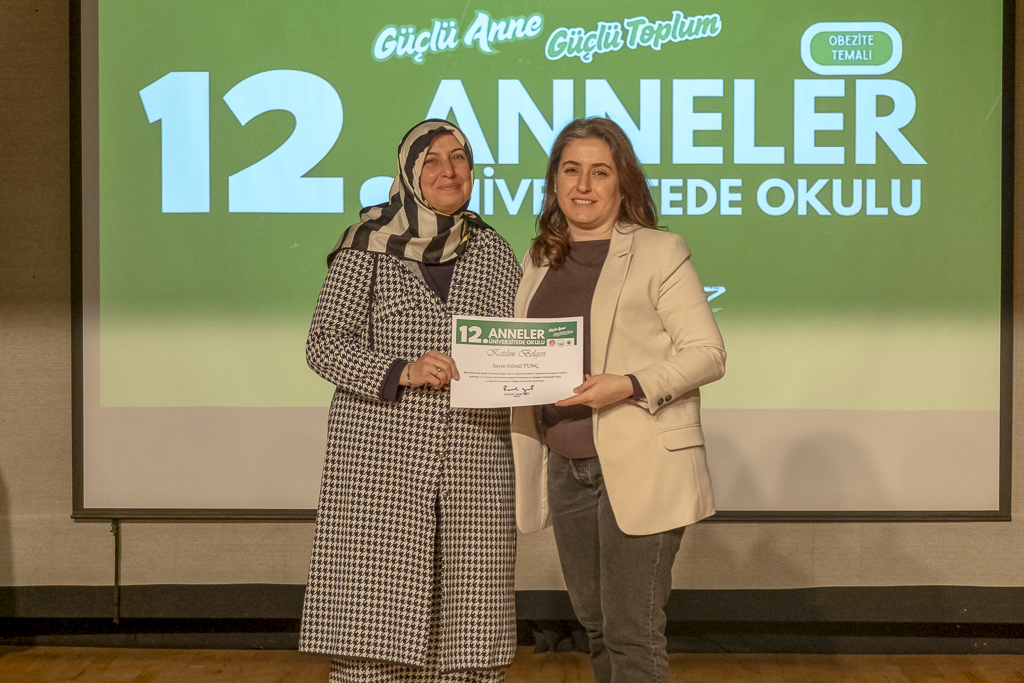 12.Anneler Üniversitede Okulu üçüncü gün etkinliklerinin sonunda sertifika töreni düzenlendi. Programın hazırlanmasında ve yürütülmesinde emeği geçen akademisyenlere teşekkür belgeleri, KATUM Müdürü Doç. Dr. Özden Gezer Oğuz tarafından takdim edildi. Annelere sertifikaları akademisyenler tarafından verildi. Obezite konusunda zengin akademik içeriğiyle annelerin bilgilendirildiği program, toplu fotoğraf çekiminin ardından sona erdi.