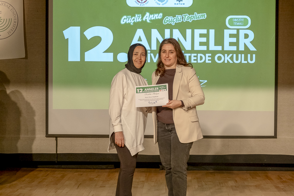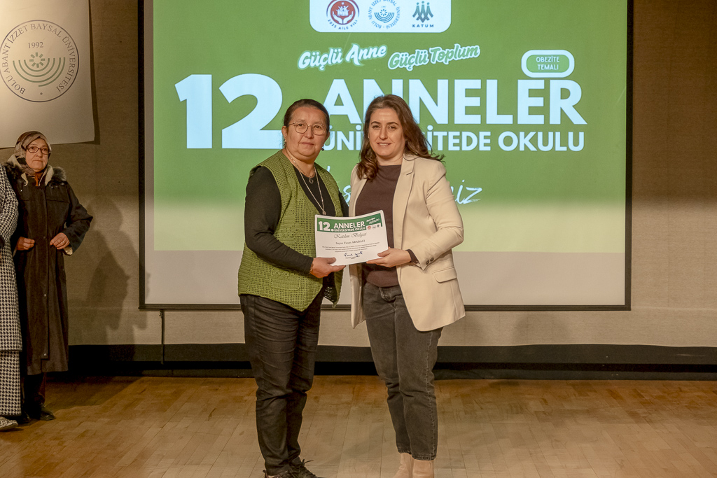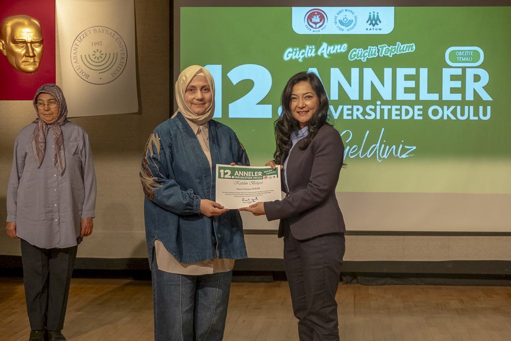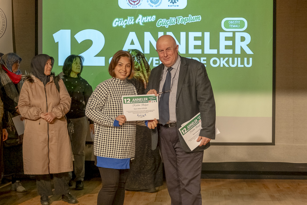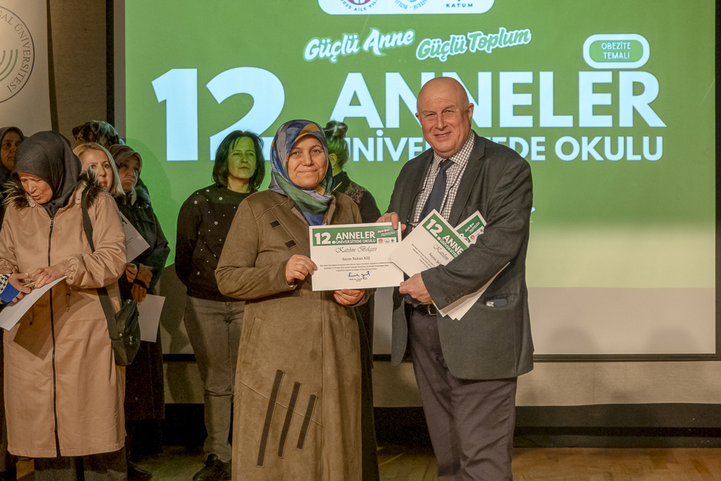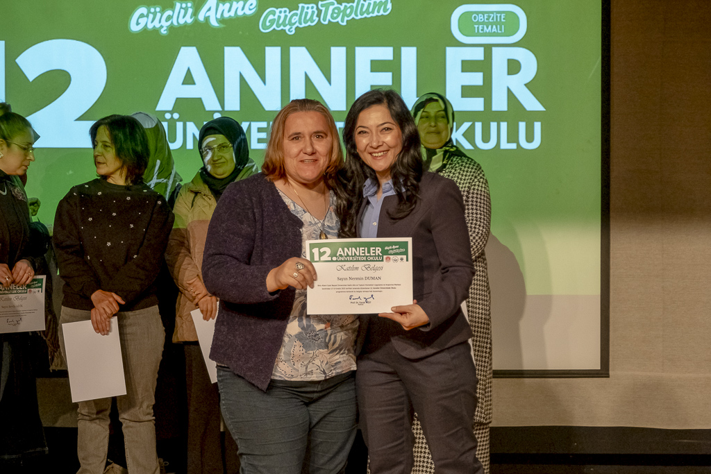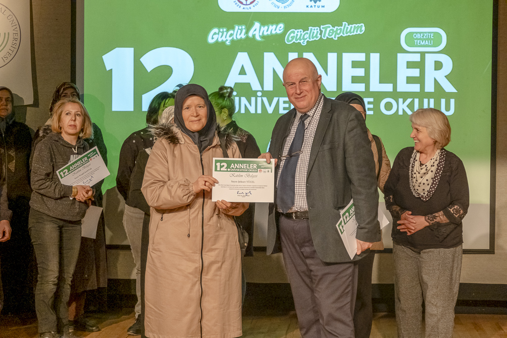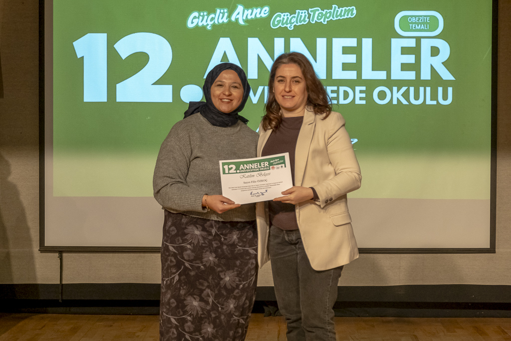 12.Anneler Üniversitede Okulu üçüncü gün etkinliklerinin sonunda sertifika töreni düzenlendi. Programın hazırlanmasında ve yürütülmesinde emeği geçen akademisyenlere teşekkür belgeleri, KATUM Müdürü Doç. Dr. Özden Gezer Oğuz tarafından takdim edildi. Annelere sertifikaları akademisyenler tarafından verildi. Obezite konusunda zengin akademik içeriğiyle annelerin bilgilendirildiği program, toplu fotoğraf çekiminin ardından sona erdi.