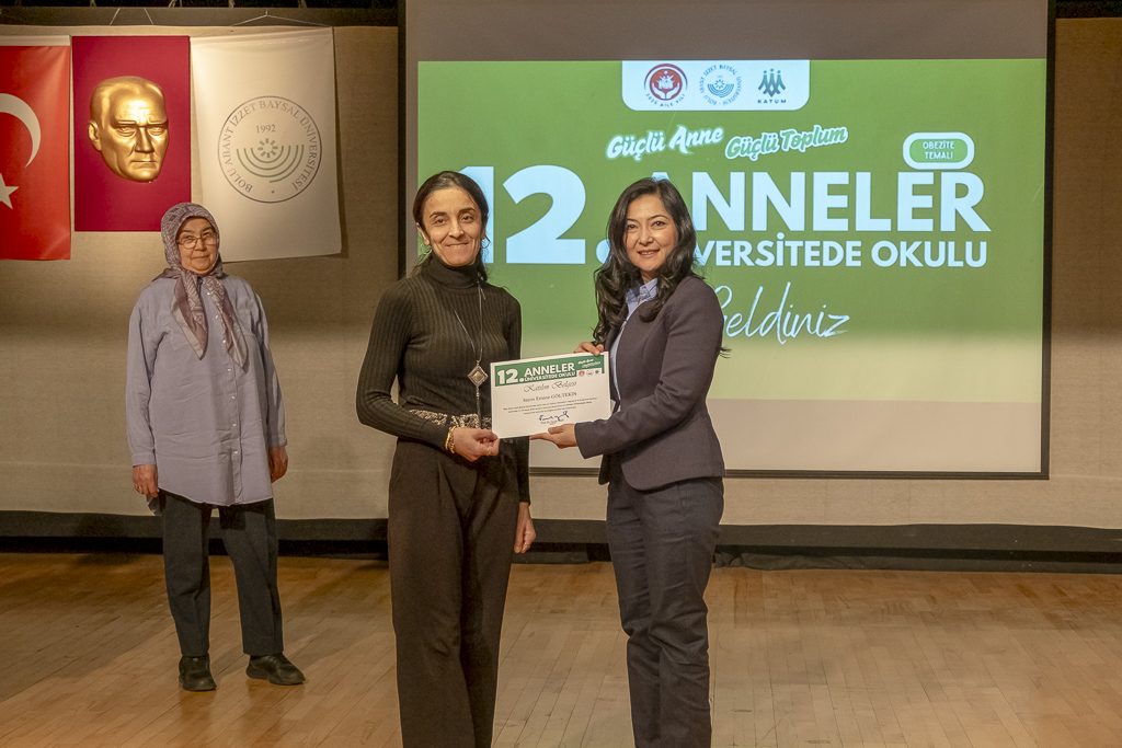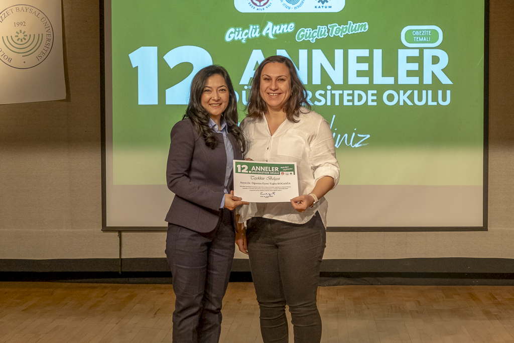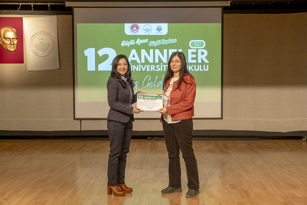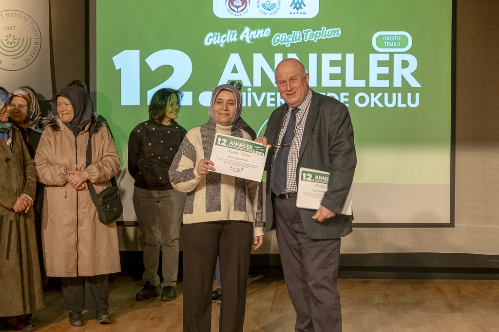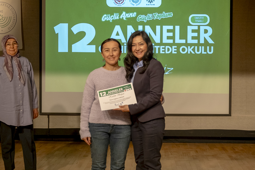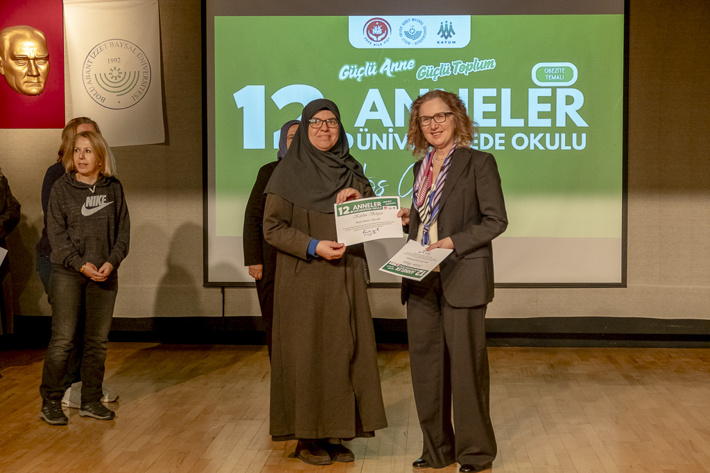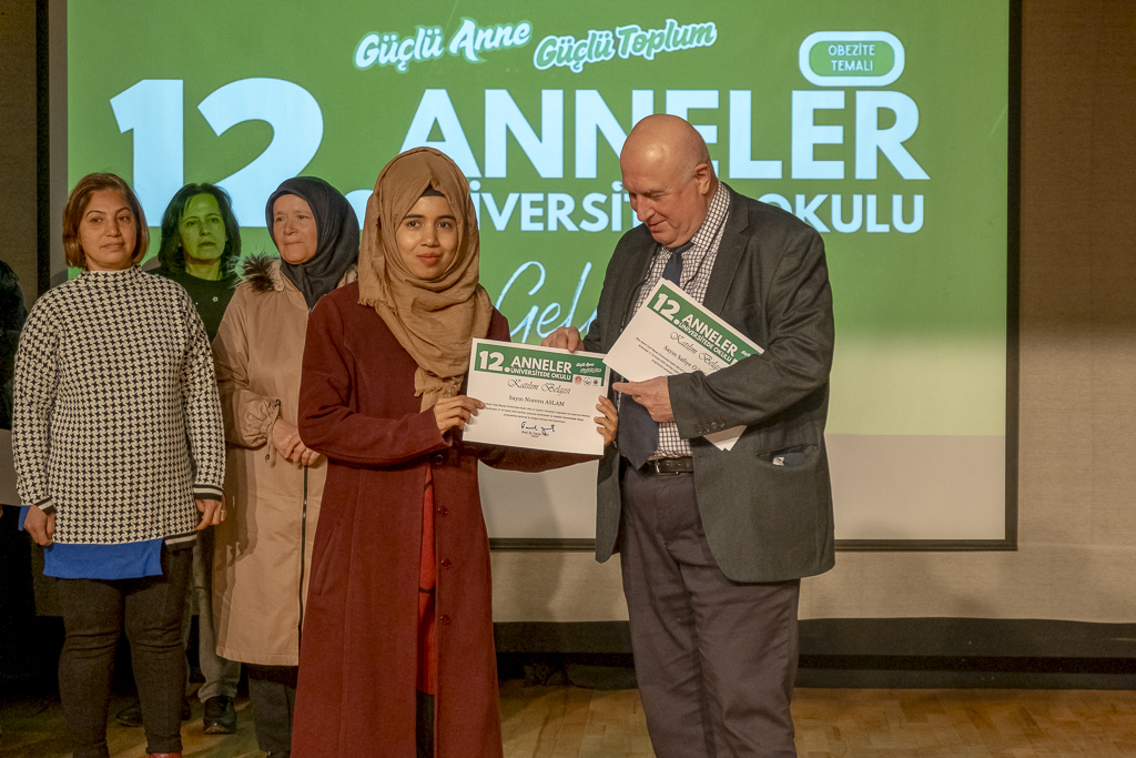 12.Anneler Üniversitede Okulu üçüncü gün etkinliklerinin sonunda sertifika töreni düzenlendi. Programın hazırlanmasında ve yürütülmesinde emeği geçen akademisyenlere teşekkür belgeleri, KATUM Müdürü Doç. Dr. Özden Gezer Oğuz tarafından takdim edildi. Annelere sertifikaları akademisyenler tarafından verildi. Obezite konusunda zengin akademik içeriğiyle annelerin bilgilendirildiği program, toplu fotoğraf çekiminin ardından sona erdi.
