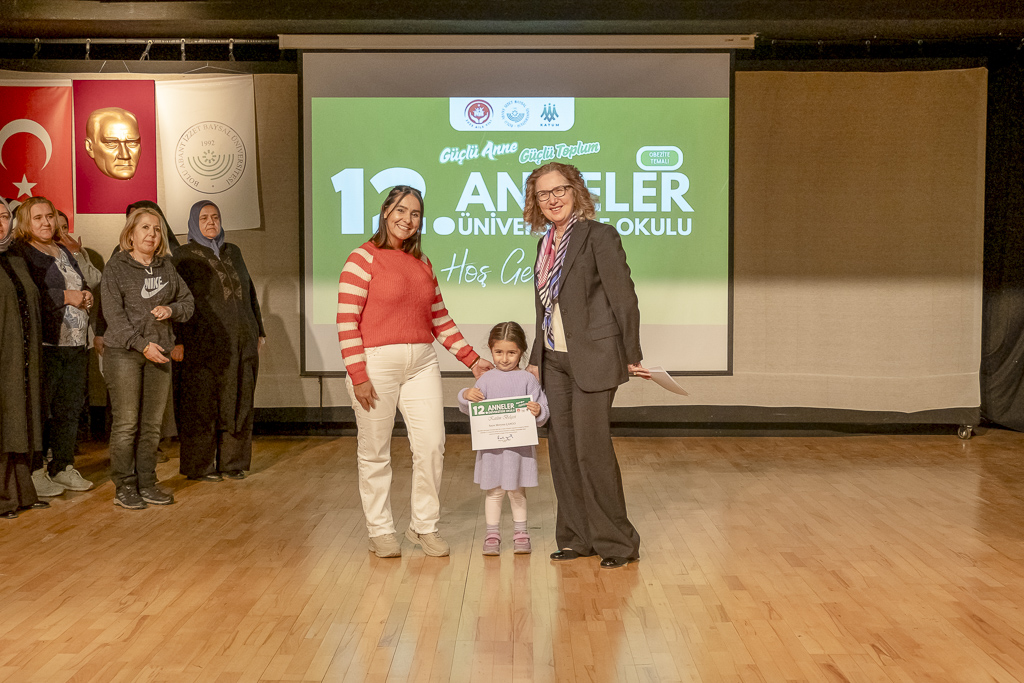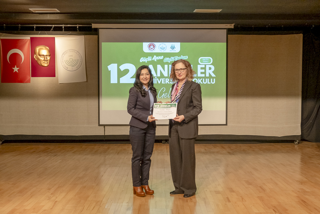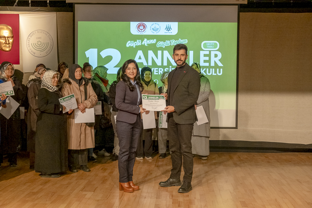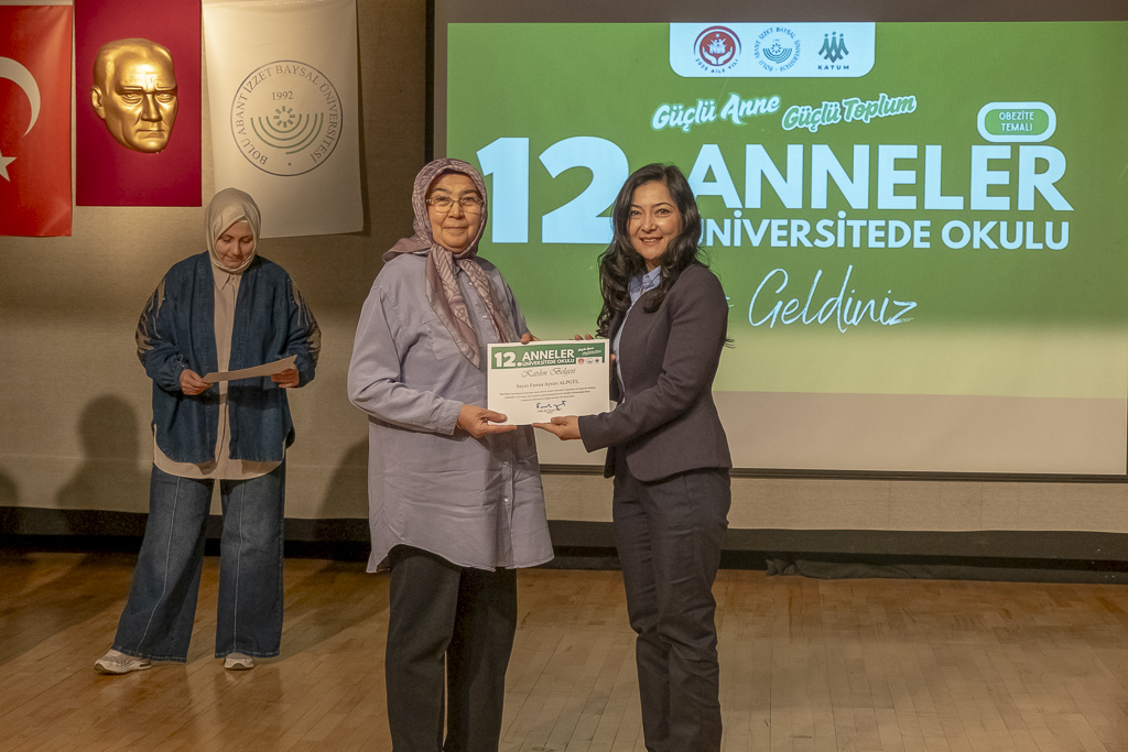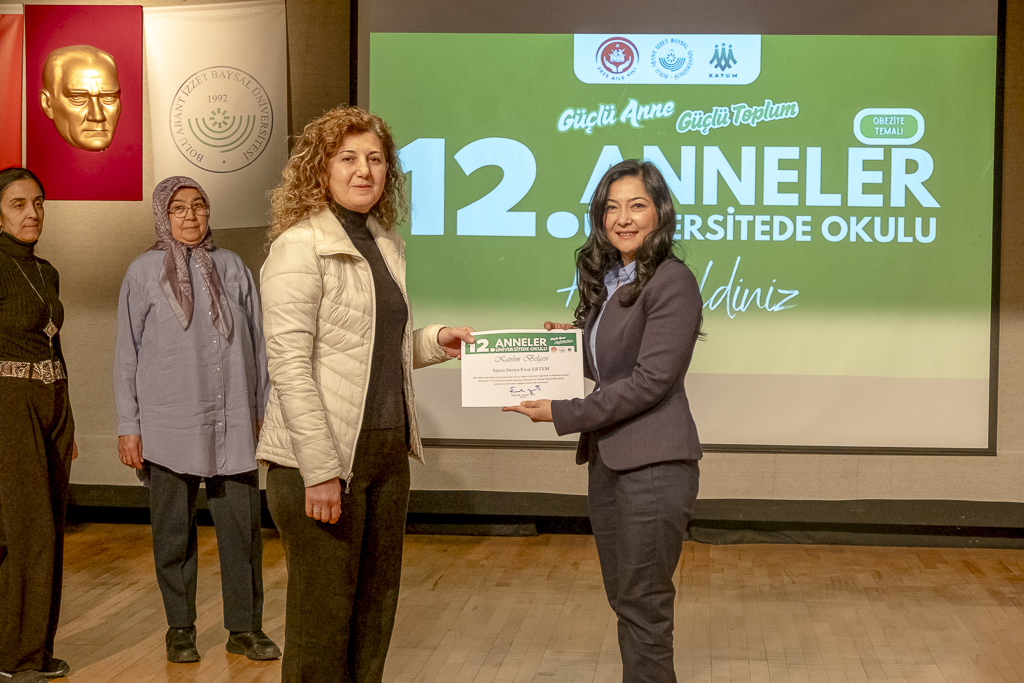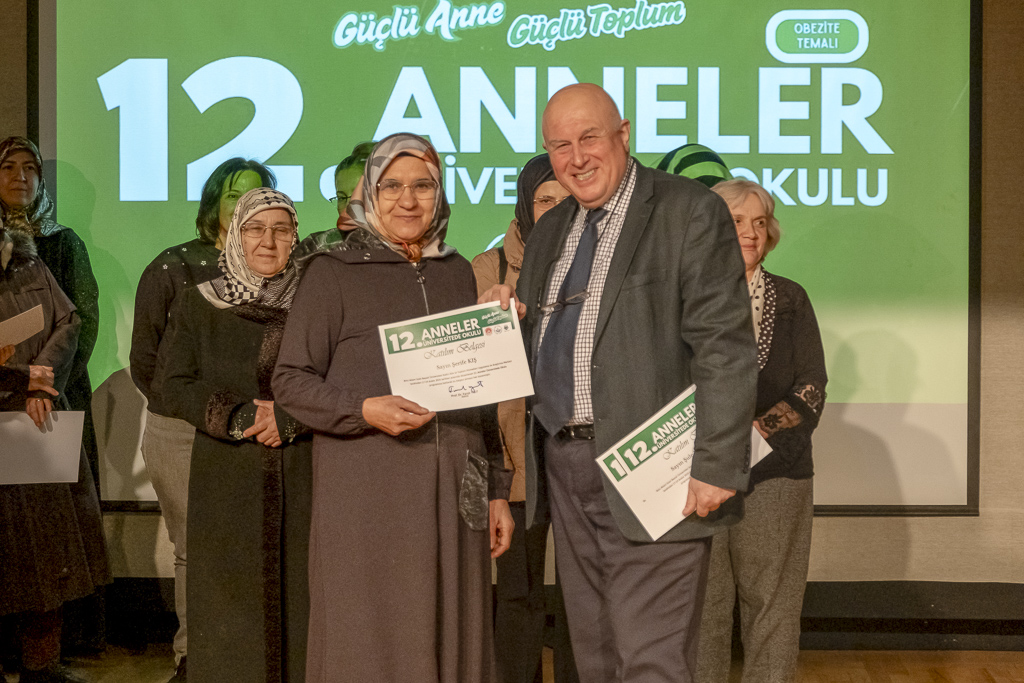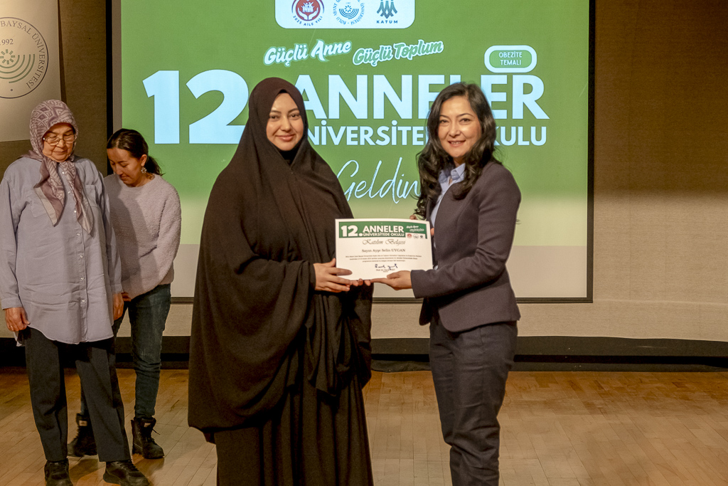 12.Anneler Üniversitede Okulu üçüncü gün etkinliklerinin sonunda sertifika töreni düzenlendi. Programın hazırlanmasında ve yürütülmesinde emeği geçen akademisyenlere teşekkür belgeleri, KATUM Müdürü Doç. Dr. Özden Gezer Oğuz tarafından takdim edildi. Annelere sertifikaları akademisyenler tarafından verildi. Obezite konusunda zengin akademik içeriğiyle annelerin bilgilendirildiği program, toplu fotoğraf çekiminin ardından sona erdi.