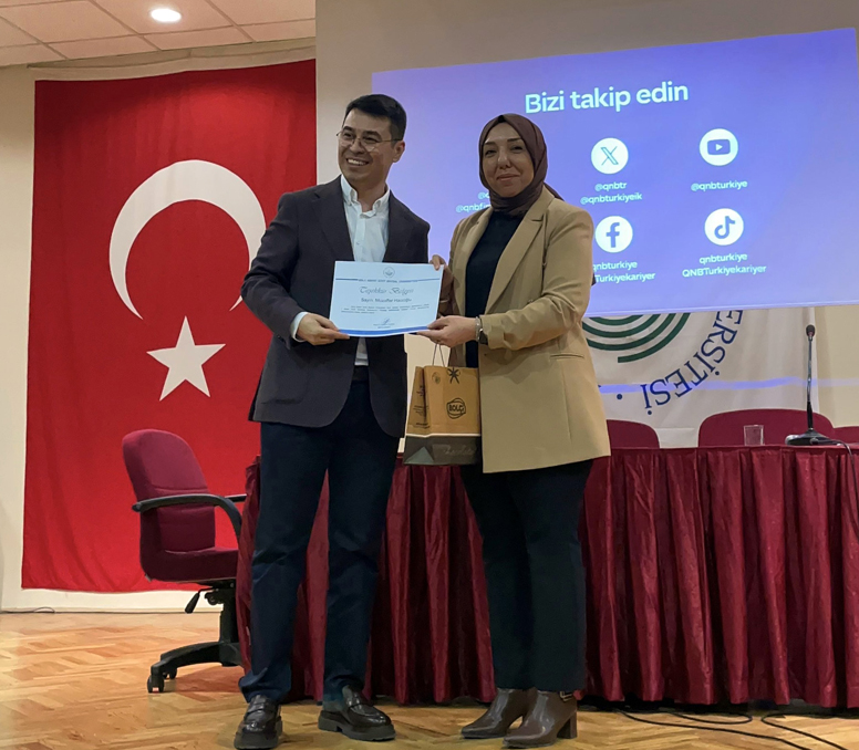 Muzaffer Hacıoğlu, gençlerin özellikle kariyer planlaması sürecinde sahip olması gereken beceriler, mülakat süreçlerinde öne çıkmanın yolları ve bankacılık sektöründeki farklı kariyer alanları hakkında öğrencileri bilgilendirdi.