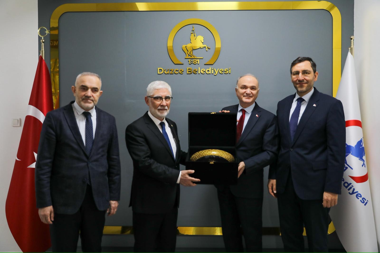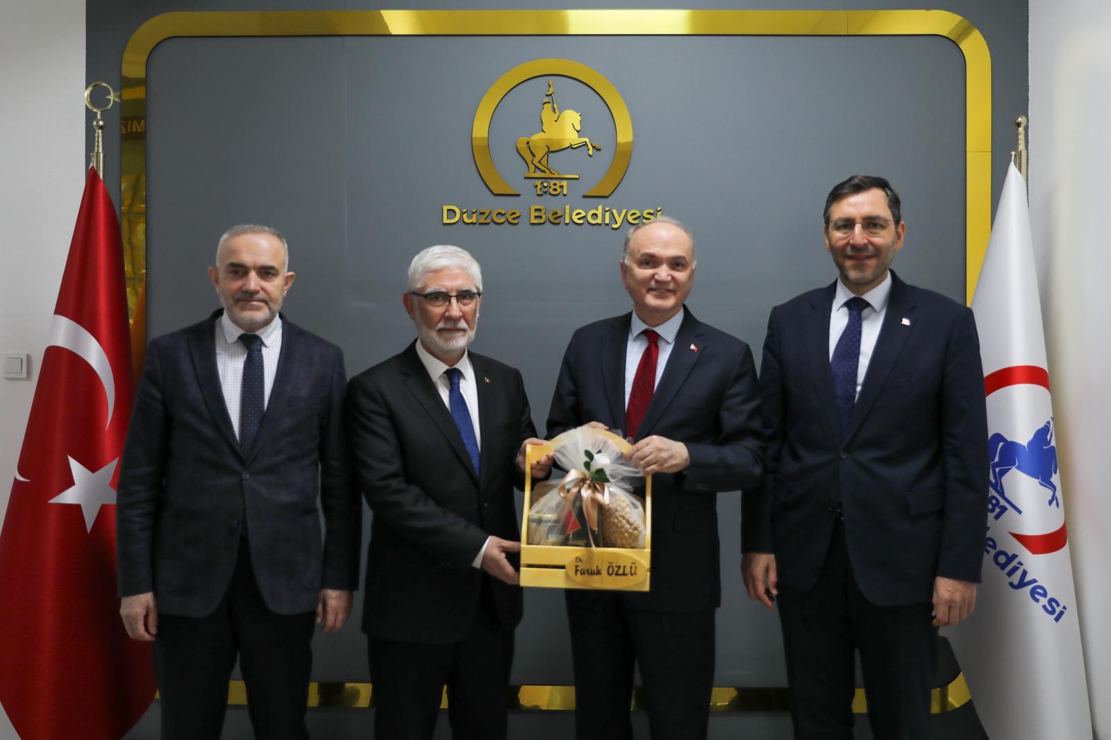 Üniversitemiz Rektörü Prof. Dr. Faruk Yiğit, beraberinde ROKETSAN Yönetim Kurulu Başkan Vekili Musa Şahin ve Genel Müdürü Murat İkinci ile birlikte Düzce Belediye Başkanı Dr. Faruk Özlü’yü ziyaret etti.