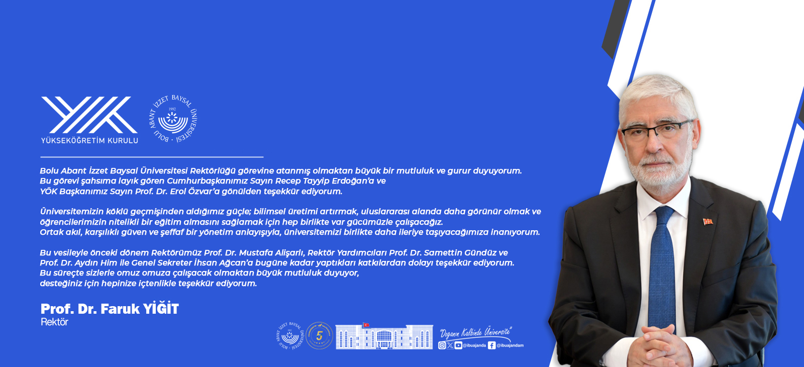Bolu Abant İzzet Baysal Üniversitesi Rektörlüğü görevine atanmış olmaktan büyük bir mutluluk ve gurur duyuyorum. Bu görevi şahsıma layık gören Cumhurbaşkanımız Sayın Recep Tayyip Erdoğan’a ve YÖK Başkanımız Sayın Prof. Dr. Erol Özvar’a gönülden teşekkür ediyorum.