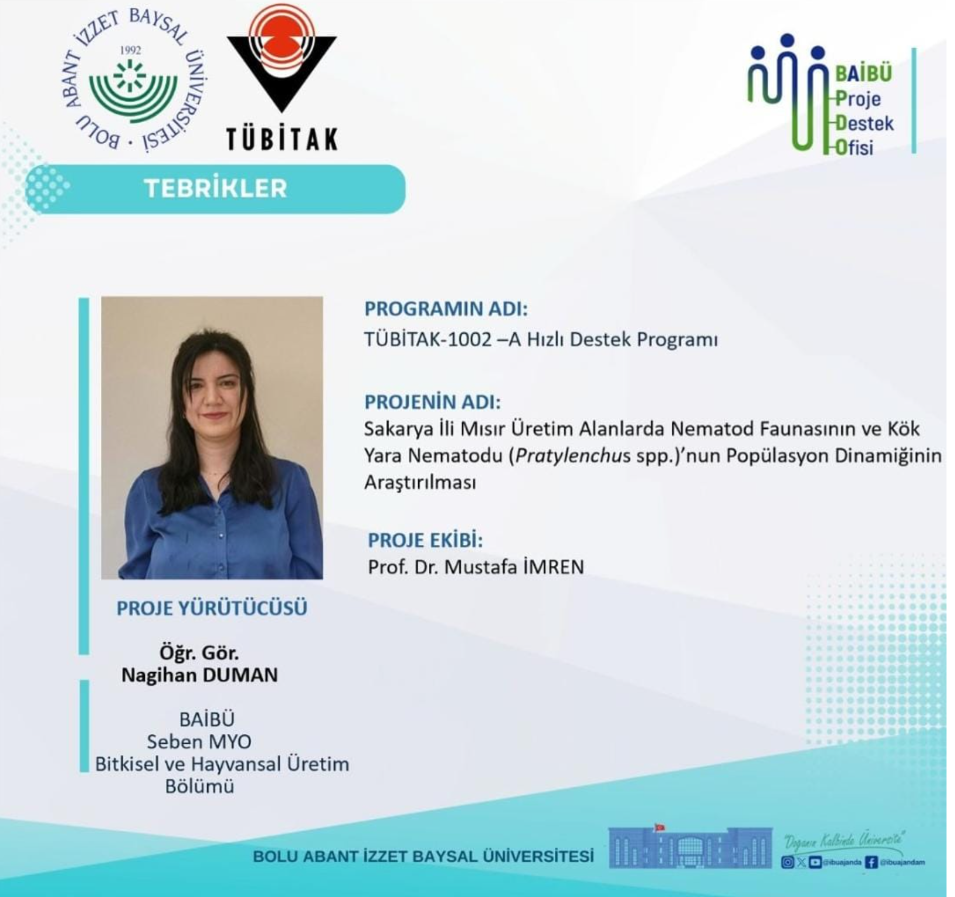BAİBÜ Seben İzzet Baysal MYO öğretim elemanlarından Öğr. Gör. Nagihan Duman’ın yürütücülüğünü üstlendiği projede, Sakarya genelindeki mısır ekim alanları taranacak. Projenin akademik kadrosunda ise bitki koruma alanındaki çalışmalarıyla tanınan BAİBÜ Ziraat Fakültesi Öğretim Üyesi Prof. Dr. Mustafa İmren araştırmacı olarak yer alıyor.