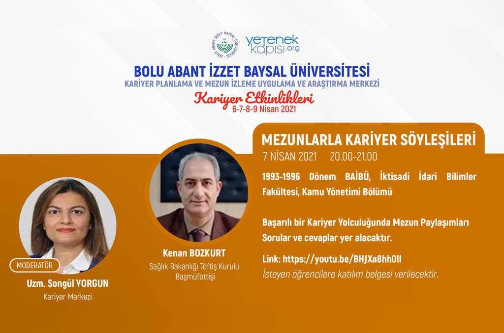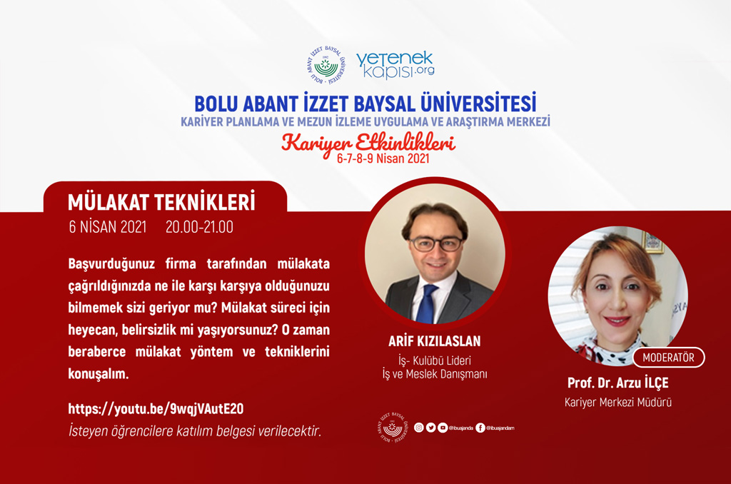 BAİBÜ Kariyer Planlama Mezun İzleme Uygulama ve Araştırma Merkezi, Yetenek Kapısı işbirliği ile ‘Kariyer Etkinlikleri 2020-2021’ adı altında bir dizi söyleşi daha düzenliyor.