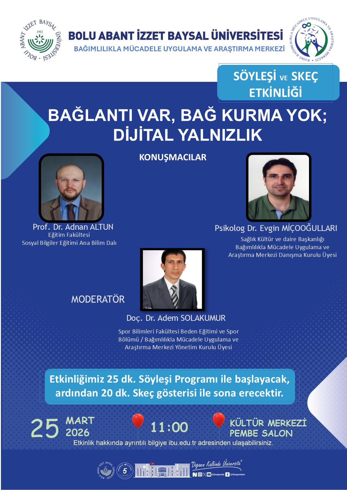 Modern çağın en önemli sorunlarından biri olan dijital yalnızlık konusunun akademik ve sosyal perspektiflerden ele alınacağı program; 25 dakikalık bir panel/söyleşi oturumu ile başlayacak, ardından 20 dakikalık tematik bir skeç gösterisi ile sona erecektir.