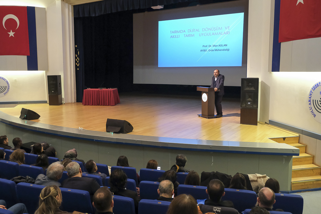 Programın davetli konuşmacısı Ankara Yıldırım Beyazıt Üniversitesi Gıda Mühendisliği Öğretim Üyesi Prof. Dr. İrfan Aslan, “Tarımda Dijital Dönüşüm ve Akıllı Tarım Uygulamaları” konulu sunum yaptı. Tarımın ana maddesinin toprak olduğunu ve insanın tarımla var olduğunu vurgulayan Aslan, insanoğlunun yeryüzündeki varlığının 150 bin yıl olduğu düşünülürse, o yıllarda daha çok emek yoğunla yapılan tarımın, günümüzde birçok değişime uğrayarak artık bilgi yoğunla yapıldığını söyledi.