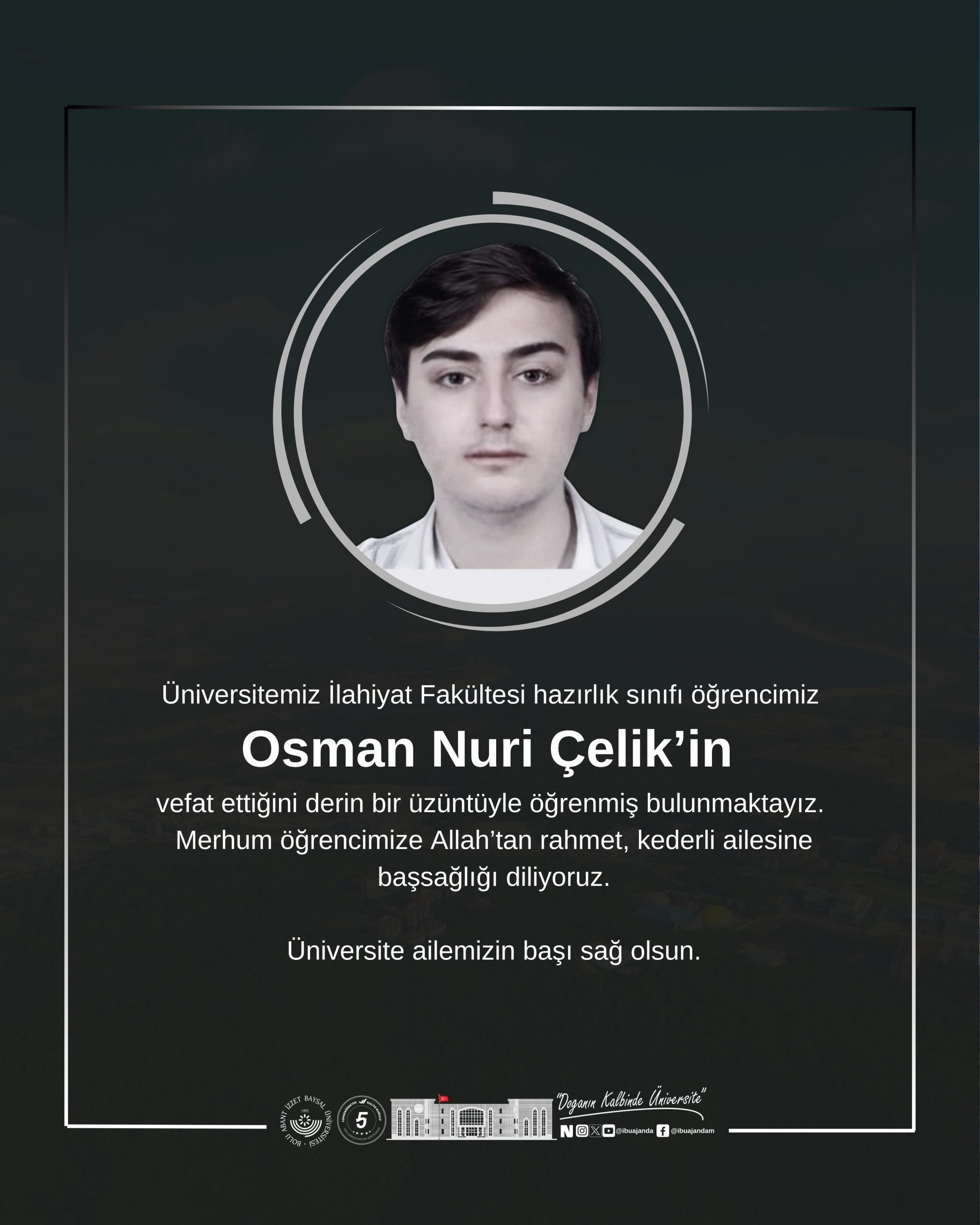Üniversitemiz İlahiyat Fakültesi hazırlık sınıfı öğrencimiz Osman Nuri Çelik’in vefat ettiğini derin bir üzüntüyle öğrenmiş bulunmaktayız.