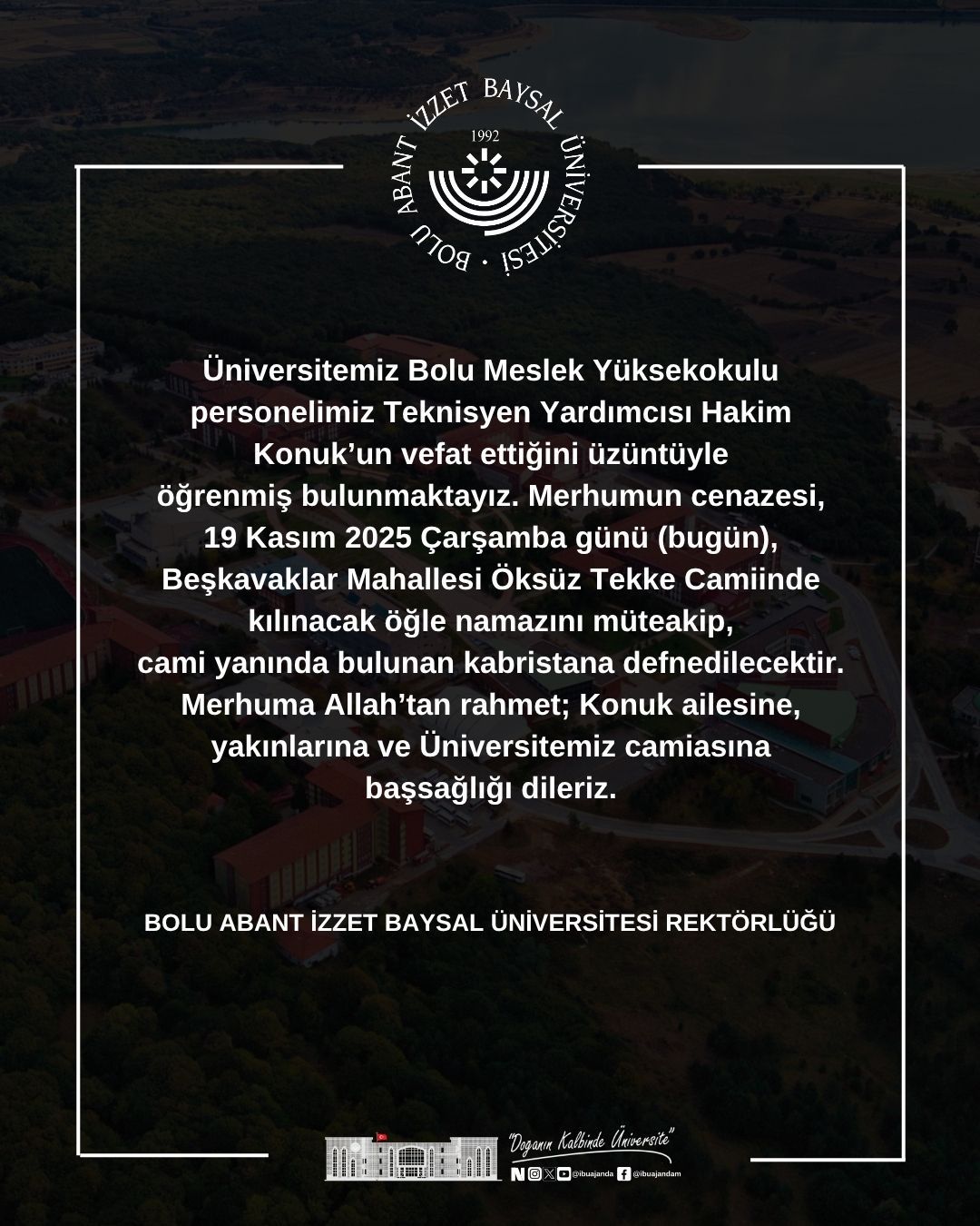 Üniversitemiz Bolu Meslek Yüksekokulu personelimiz Teknisyen Yardımcısı Hakim Konuk’un vefat ettiğini üzüntüyle öğrenmiş bulunmaktayız.
