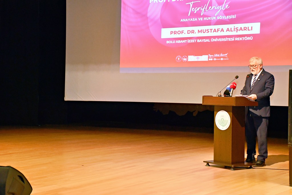 Bu akademik yılın da bizlere yeni bir enerji, sorumluluk ve vizyon kazandırdığına işaret eden Rektör Alişarlı, “Bu vizyonun merkezinde hukukun üstünlüğü, adalet anlayışı ve demokratik değerlere bağlılık yer almaktadır. Bugün gerçekleştirdiğimiz bu söyleşi, sadece hukuk öğrencilerimiz için değil, hepimiz için anayasal düşüncenin derinliğini ve güncelliğini yeniden değerlendirmek açısından kıymetli bir fırsattır.” dedi.