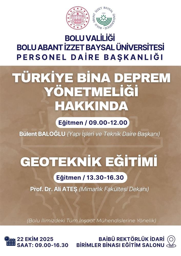 İlgili Eylem Planı kapsamında Üniversitemiz Personel Daire Başkanlığı Hizmet İçi Eğitim Şube Müdürlüğü tarafından Bolu ilinde görev yapan inşaat mühendislerine yönelik 22 Ekim 2025 tarihinde 09.00-12.00 saatleri arasında