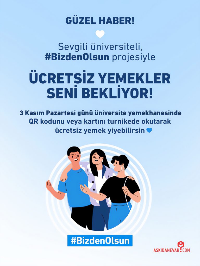 3 Kasım 2025 Pazartesi günü, #BizdenOlsun projesi kapsamında üniversitemiz yemekhanesinde sizleri ücretsiz yemek ikramı bekliyor. 🍽️