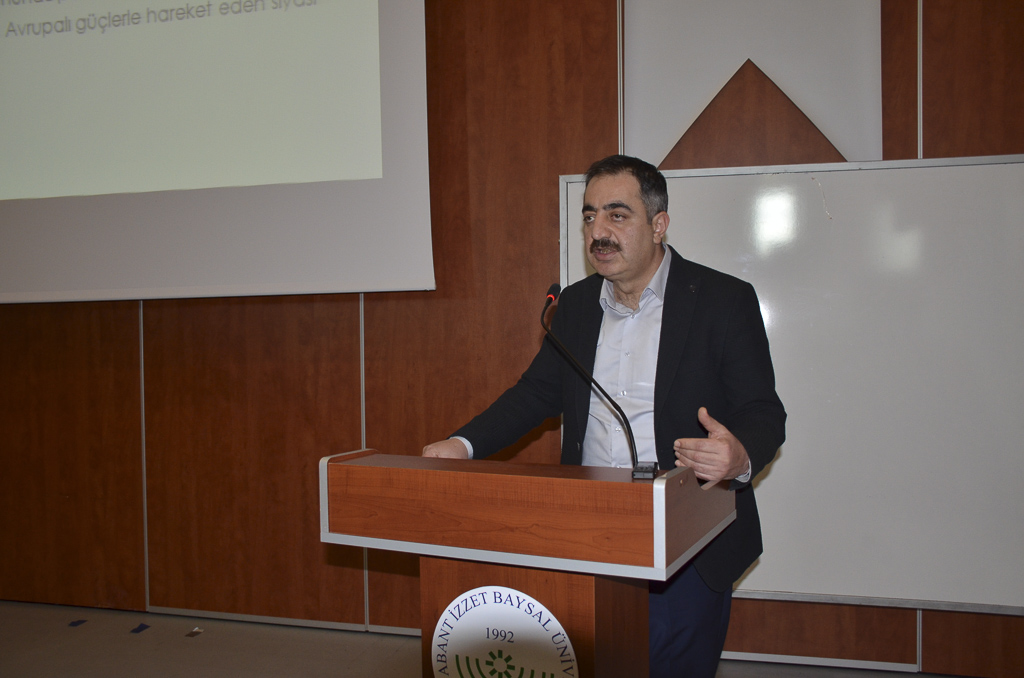 Bolu Abant İzzet Baysal Üniversitesi (BAİBÜ) Göç ve Ortadoğu Topluluğu’nun BAİBÜ Kongre Merkezi Yeşil Salon’da düzenlediği söyleşiye BAİBÜ İktisadi ve İdari Bilimler Fakültesi Uluslararası Siyaset Anabilim Dalı Öğretim Üyesi Prof. Dr. Veysel Ayhan konuşmacı olarak katıldı.
