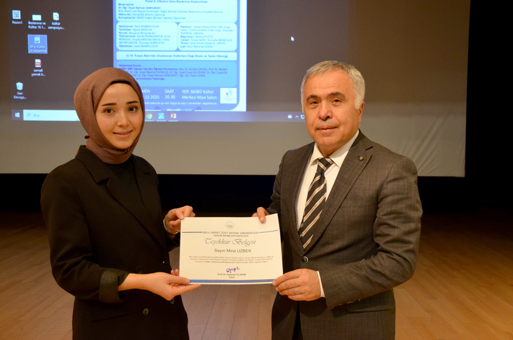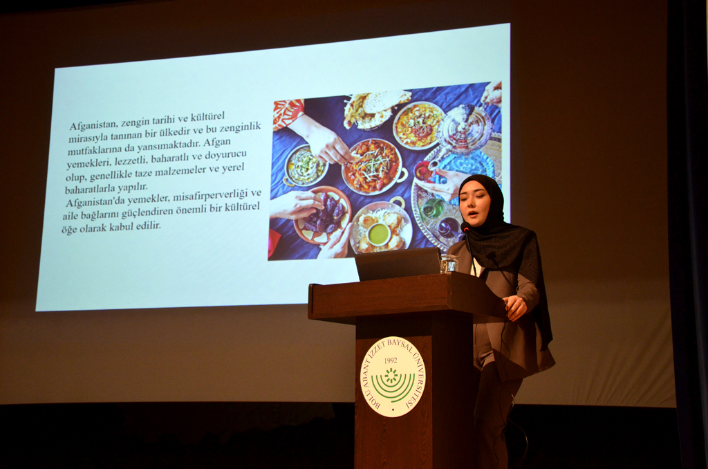 Beslenme ve Diyetetik Bölümü Öğretim Üyesi Dr. Bahram Sarkarati ve Hemşirelik Bölümü Öğrencisi Albina Ali’nin moderatörlüğünü yaptığı “Ülkelere Göre Beslenme Alışkanlıkları” başlıklı ikinci panelde ise, Sağlık Bilimleri Fakültesi’nde öğrenim gören uluslararası öğrencilerimiz, ülkelerindeki geleneksel yeme-içme ve mutfak kültürü hakkında bilgi verdi.