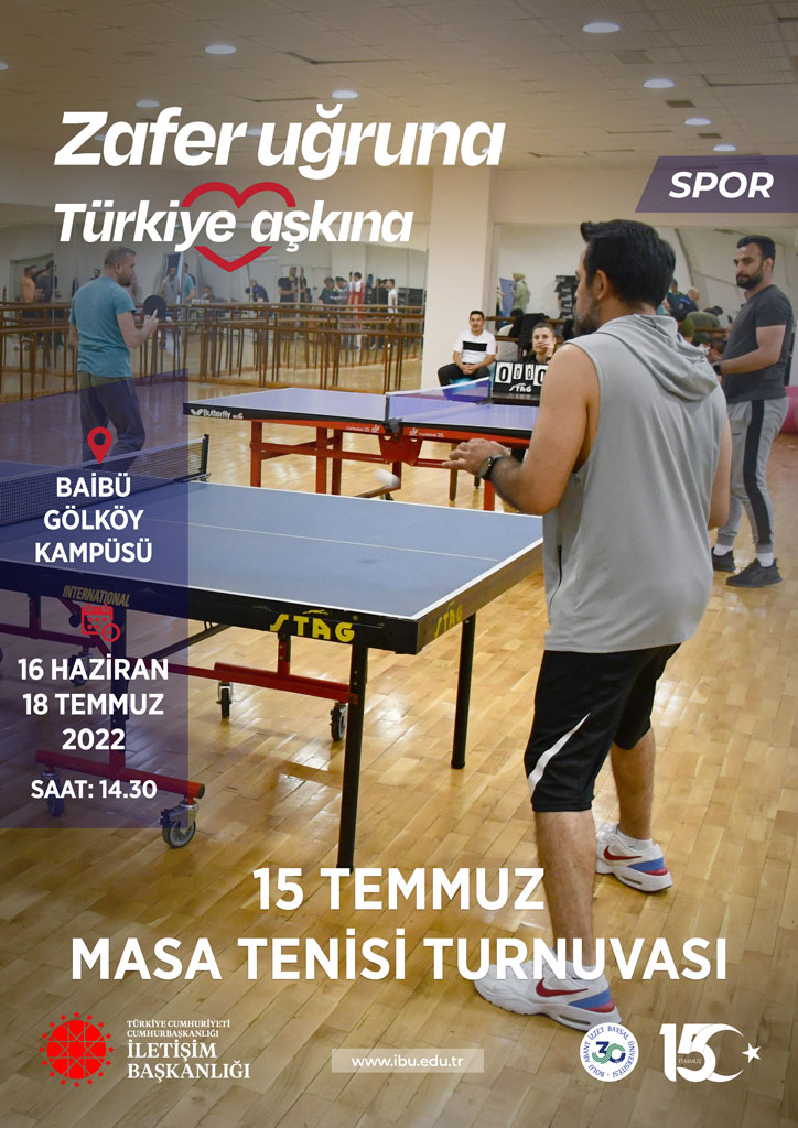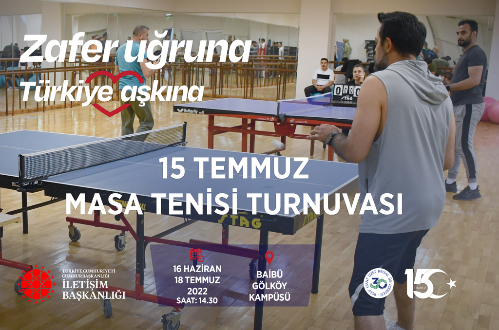 - 15 Temmuz Masa Tenisi Turnuvası – Spor Etkinliği / 16 Haziran 18 Temmuz Saat: 14.30