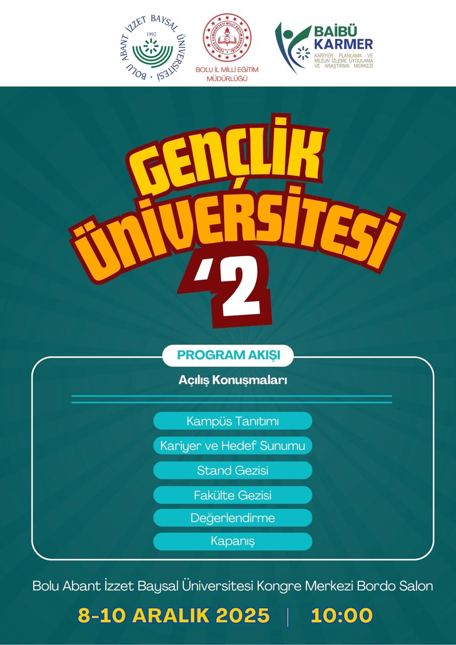 Üniversitemiz ve Bolu İl Milli Eğitim Müdürlüğü iş birliğiyle bu yıl ikincisi düzenlenecek Gençlik Üniversitesi başlıyor. Gençlik Üniversitesi Programı ile; üniversitemiz ile liseler arasındaki akademik iş birliğinin artırılması, öğrencilere kariyer planlama desteği sağlanması, gençlerin bilim, sanat, spor ve teknoloji alanlarında aktif rol almasının teşvik edilmesi ve şehrin eğitim ekosistemine yeni bir dinamizm kazandırılması hedefleniyor.