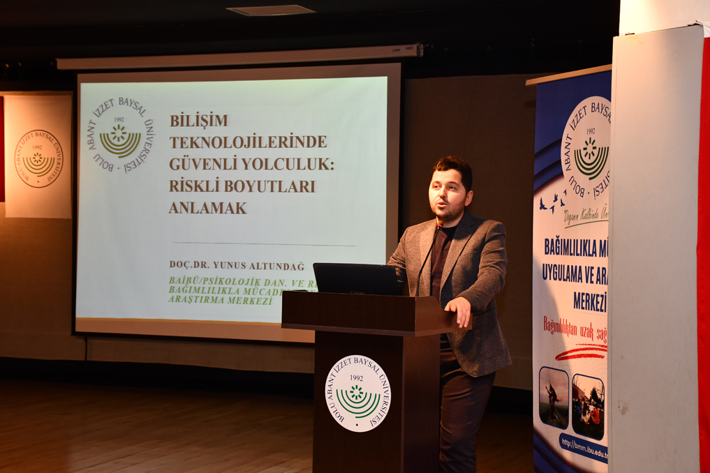 Açılış konuşmasının ardından moderatörlüğünü Bağımlılıkla Mücadele Uygulama ve Araştırma Merkezi Müdürü Doç. Dr. Makbule Tokur Kesgin’in yaptığı panele geçildi. İlk sunumu, Eğitim Fakültesi Rehberlik ve Psikolojik Danışmanlık Anabilim Dalı Öğretim Üyesi Doç. Dr. Yunus Altundağ, “Bilişim Teknolojilerinde Güvenli Yolculuk, Riskli Boyutları Anlamak” başlığı kapsamında yaptı.
