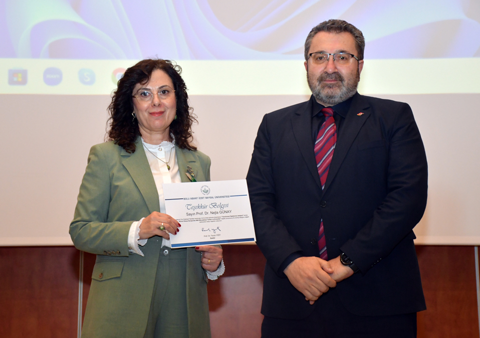 Prof. Dr. Nejla Günay’a Rektör Yardımcısı Prof. Dr. Kaya Yıldız tarafından teşekkür plaketi takdim edildi.