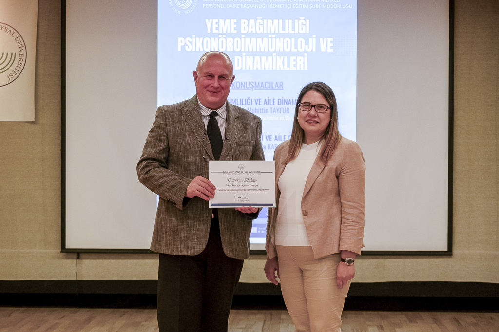 Etkinlikte Üniversitemiz Öğr. Üyesi Prof. Dr. Muhittin Tayfur “Yeme Bağımlılığı ve Aile Dinamikleri” başlıklı sunum yaparken Öğr. Gör. Dr. Şeyda Karabörk “Psikonöroimnünoloji ve Aile Dinamikleri” başlıklı sunum yaptı.
