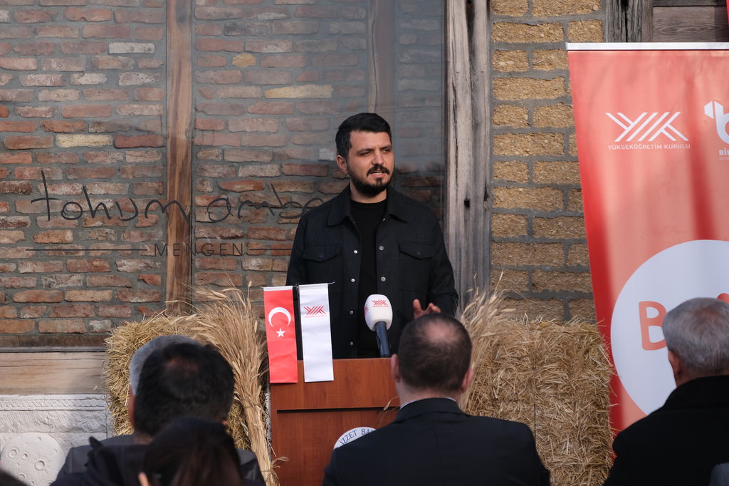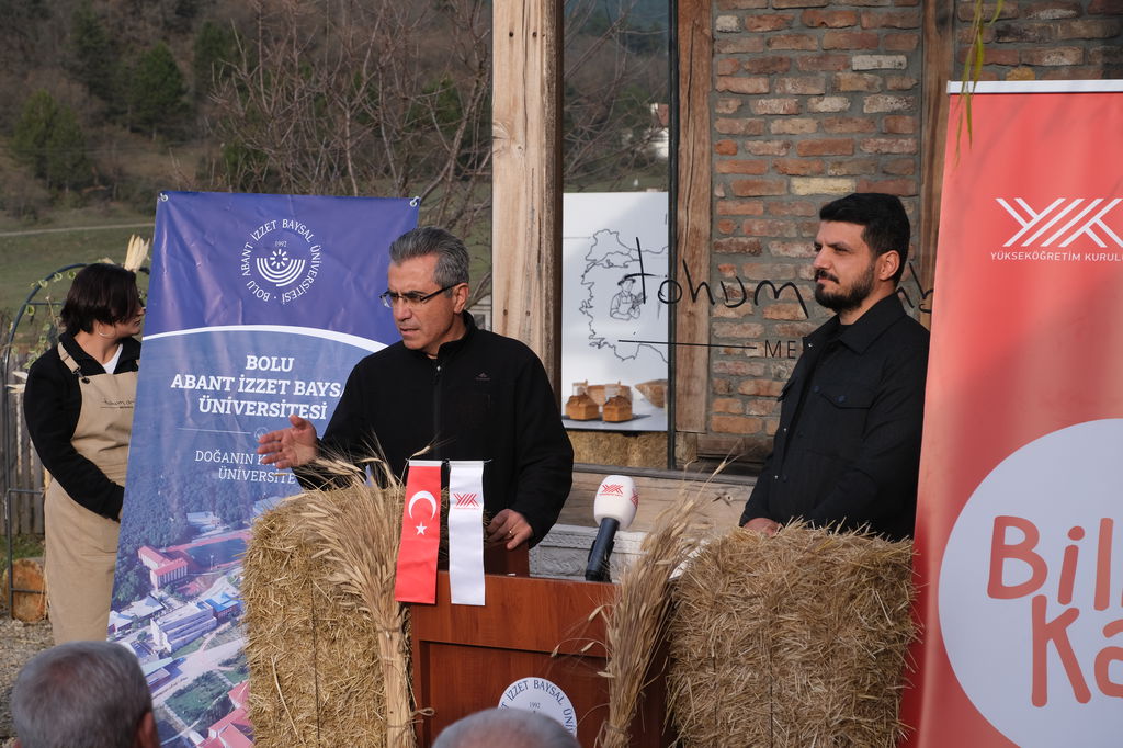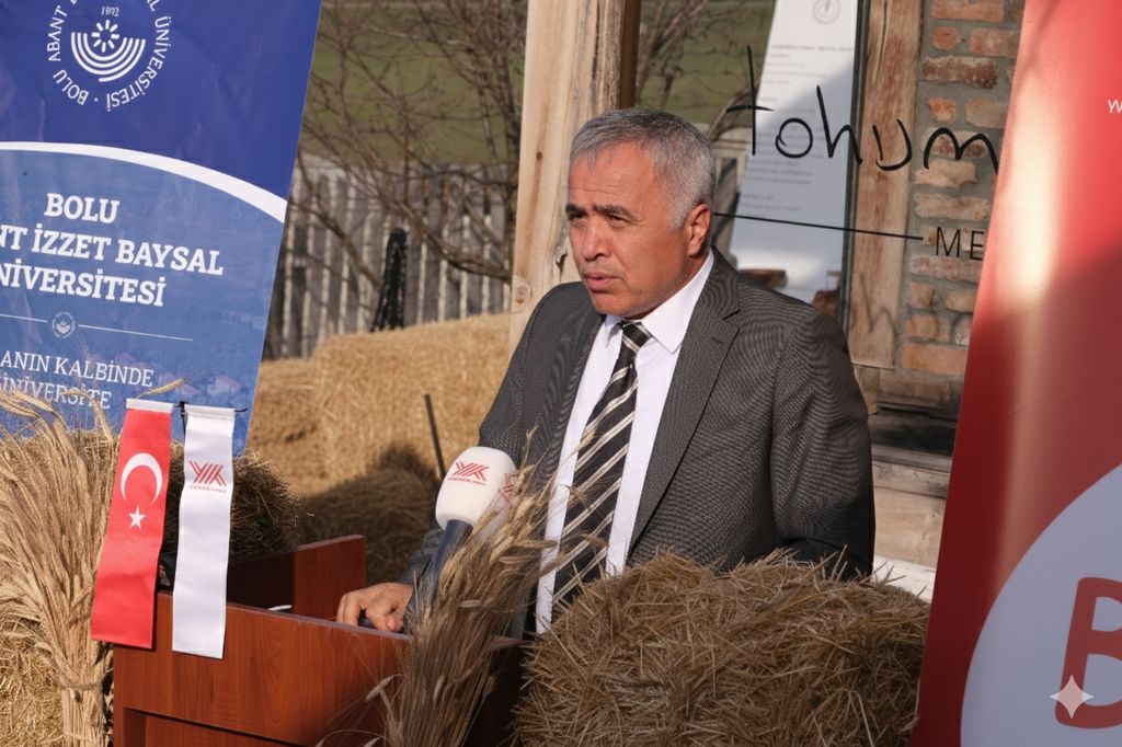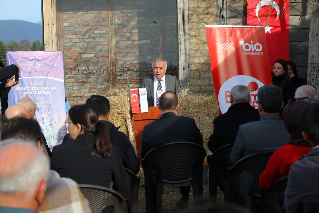 “Aramızda bulunan üretici Melike Kaya’nın fırınında ürünlerimiz üretiliyor. Yine aramızda çiftçilerimiz var. Cenk ağabeyimiz, Serdar kardeşimiz, Rabia, Orhan ve Şeref ağabeyimiz ve diğer üreticilerimiz var. Burayı hayata geçirirken en çok destek aldığım kişilerden biri Mengen İlçe Tarım Müdürlüğü’nde Ziraat Mühendisi olarak çalışan İbrahim bey oldu. Tüm bu yol arkadaşlarıma teşekkür etmek istiyorum. Tohum Ambarı’nda şu anda 610 çeşit ata tohumu bulunuyor. Kayıt altına alınmayı bekleyen 100’ün üzerinde tohumumuz mevcut. Her bir tohum bizim için Iza kadar değerli. Şu anda burada gördüğünüz balyalar, Iza buğdayı balyaları. Gördüğünüz buğday ise, Iza buğdayı. Iza buğdayı, insanoğlunun ilk kültür aldığı buğdayı ve yaklaşık 12 bin yıllık bir geçmişe sahip. Yazın Karahantepe ve Göbeklitepe kazı alanlarındaydım. Kazı Başkanı Prof. Dr. Necmi Karul hocamızın programlarında bulunduk. Orada yavaş buğday programını gerçekleştirdik. Yine orada tescillendi ki Iza, insanoğlunun ilk kültürünü aldığı buğdaydır. Yüzyıllar içerisinde Seben’e geliyor ve Iza ismini alıyor; Kastamonu’ya gidiyor ve siyez ismini alıyor. 4 yıl önce de Seben’de tohumları Reşat beyden alarak, ilk kez burada toprakla buluşturduk. Şu anda 141 dönümdeyiz. Bizim haricimizdeki üreticilerimiz, aramızda Cengiz ağabey başta olmak üzere 100 dönüme yakın alanda Iza buğdayı ekilmekte. Yani toplamda 250 dekara yakın bir üretim durumu söz konusu. Hedefimiz, günden güne büyütmek bu üretimi. Tabii sadece ekim yapmıyoruz. Izambar ismiyle bir ekşi maya oluşturduk. Bu ekşi mayadan ekmek, simit, açma, poğaça yaptık. Grissini, biscotti, bisküvi yaptık. Cengiz ağabey gözleme yaptı, birazdan misafirlerimize ikram edeceğiz. Şuna inanıyorum ki, üreticiye ulaşmayan bir ürün, sürdürülebilirlik noktasında gerçekçi olamıyor. O yüzden hem ticari tarafını yaşaması lazım hem de tüketiciye ulaşması lazım. Tohum Ambarı, 18 Mart Çanakkale Zaferi haftasında yılda sadece 1 defa tohum dağıtır. 5 yıldır da bunu şehitlerimizin ruhuna ithafen gerçekleştiriyoruz. Şehitlerimiz bizim için her zaman çok kıymetli. Tohum Ambarı, akademik çalışmalara da ev sahipliği yapıyor. Ziraat Fakültesi bünyesindeki yüksek lisans tez çalışmasına ev sahipliği yapıyoruz. Iza’nın biochar gübreye karşı performans analizini oluşturacak 400 metrekarelik parseli oluşturduk. Gübreleme ve ekim faaliyetleri yapıldı. Yüksek lisans öğrencimiz takibini yapıyor olacak. Dolayısıyla sadece tohum muhafaza edilen bir yer değil burası. Tohum Ambarı yaşayan bir mekân. Bu kapsamda da çalışmalarımıza devam edeceğiz. Tohum Ambarı’nda özellikle üniversitemizin ve diğer paydaş kurumlarımızın desteğini hissetmek bizi motive eden bir durum. Çok teşekkür ediyorum. Gentaş Yönetim Kurulu Başkanı Orhan Kahraman’a da verdiği bütün desteklerden dolayı teşekkür ediyorum.”