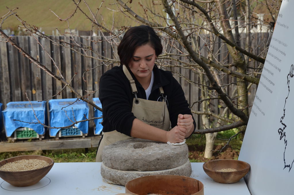 Açılış konuşmalarının ardından Mengen ilçesindeki Tohum Ambarı’nın kurucusu Öğr. Gör. Berker Çiftçi, Tohum Ambarı’nın kuruluşu, faaliyetleri ve hedefleri ile ata tohumu Iza buğdayının üretim aşamaları hakkında sunum gerçekleştirdi. Tohum Ambarı’nın yaklaşık 10 yıl önce hayatına başladığını söyleyen Çiftçi, özetle “Tohum Ambarı, atalık tohumları dert edinen bakış açısı ve bunları bir yerde muhafaza etmek amacıyla yola koyuldu. İhsan ağabeyimizle birlikte 5 yıl önce inşasına başladık. Gördüğünüz bu yapı ileri dönüşüm bir yapı. Ana taşıyıcılarını devlet demiryolu raylarının altındaki traverslerden inşa ettik. Orta kısımdaki kerpiç yapıyı oğlum Yağız’la birlikte birkaç haftada oluşturduk. Burada hayalimiz sadece muhafaza etmek değil, çoğaltmak, paylaşmak ve aktarmakla ilgiliydi. Bugün geldiğimiz noktada bunların tümünü yapabiliyoruz artık.” dedi.