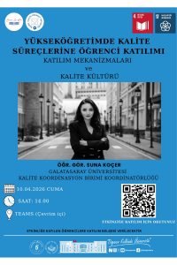 Kalite Öğrenci Topluluğu tarafından düzenlenen “Yükseköğretimde Kalite Süreçlerine Öğrenci Katılımı: Katılım Mekanizmaları ve Kalite Kültürü” başlıklı etkinlik, 10 Nisan 2026 Cuma günü saat 14.00’te Microsoft Teams platformu üzerinden çevrim içi olarak gerçekleştirilecektir. Etkinlikte Galatasaray Üniversitesi Kalite Koordinasyon Birimi’nden Öğr. Gör. Suna Koçer konuşmacı olarak yer alacaktır. Tüm öğrencilerimiz davetlidir.